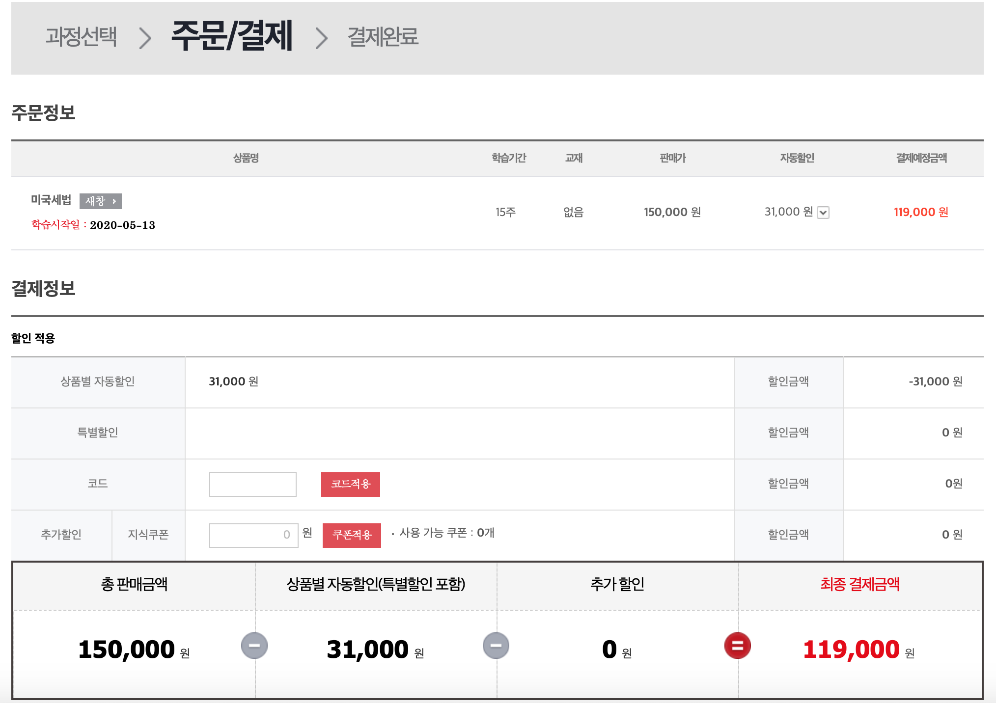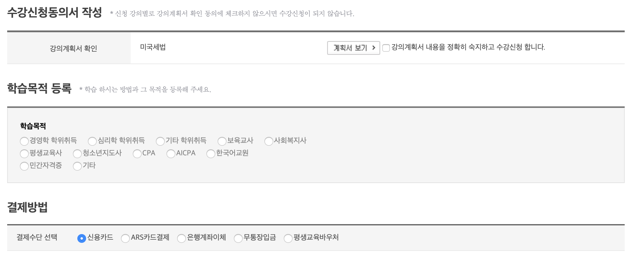 본인인증을 하고 나면 위와 같이 결제 하실 수있는 페이지를 보실 수 있습니다. 본인이 수강 신청하신 과목과 금액을 확인하시고 계획서도 보실 수 있으니 수강신청하시기 전에 최종적으로 내가 필요한 과목인지 확인하시고 학습목적 등록과 결제 방법을 선택하고 결제하시면 수강신청이 완료 됩니다. 별도의 교재는 없고 수강 신청 후 과목이 개설되면 학습노트 등을 다운로드 받아 수강하시면 됩니다.