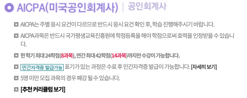 미국 공인회계사에 대한 간단한 설명이 나오고 평생교육원에서 학점 이수 후 국가평생교육진흥원에 학점등록을 해야 학점으로써 효력을 인정 받을 수 있다는 내용이 나오는데 이는 추후 포스팅에서 다루도록 하겠습니다.