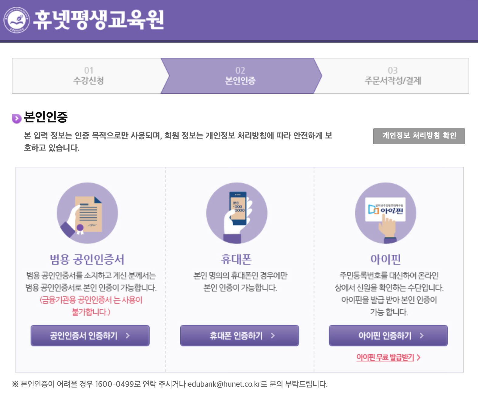 본인 인증이 필요한 이유는 대리 수강이나 부정행위와 같은 부분들을 막기 위한 절차로 이해하시면 되고 공인인증서, 휴대폰 인증, 아이핀 인증 등을 통해 본인 확인을 반드시 하셔야 합니다. 이 중 편한 방법을 택하셔서 본인 인증을 진행하시면 됩니다. 참고로 저는 공인인증서를 등록하고 인증하였으며 공인인증서가 있으셔야 나중에 시험 응시, 모바일 수강 등을 하실 수 있으니 공인인증서를 하나 등록하시는것을 추천드립니다.