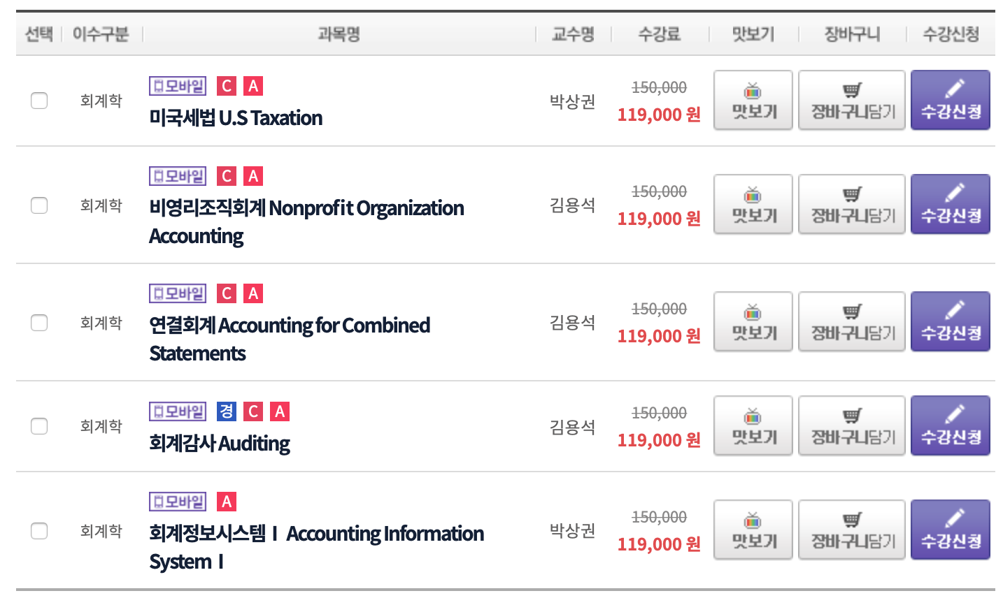 참고로 저는 이 중에서 중급재무회계 1, 회계이론, 비영리조직회계, 연결회계, 회계감사, 회계정보시스템 이렇게 6과목 18학점을 수강신청하고, 최종적으로 모든 과목을 이수하여 18학점을 취득하게 되었습니다. 이와 관련해서는 추후 포스팅에서 강의 수강방법 등을 다룰 때 다시 한번 포스팅하도록 하겠습니다.