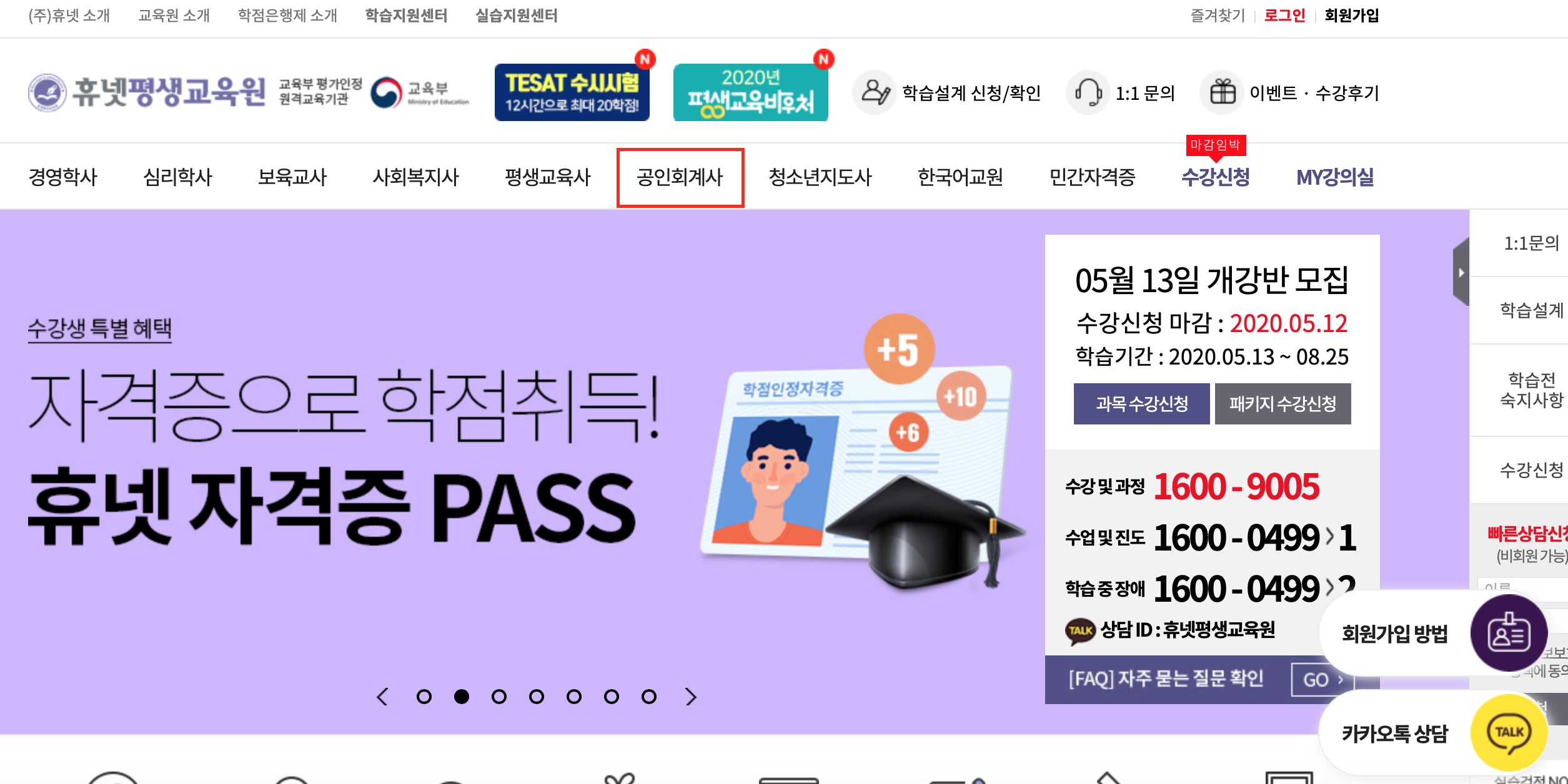휴넷 홈페이지에 들어가면 위와 같은 화면이 나오고 여기에서 회원가입을 하시고 공인회계사라는 메뉴를 선택하시면 공인회계사를 위한 시험제도 설명 및 수강에 필요한 과목들을 선택할 수 있습니다.