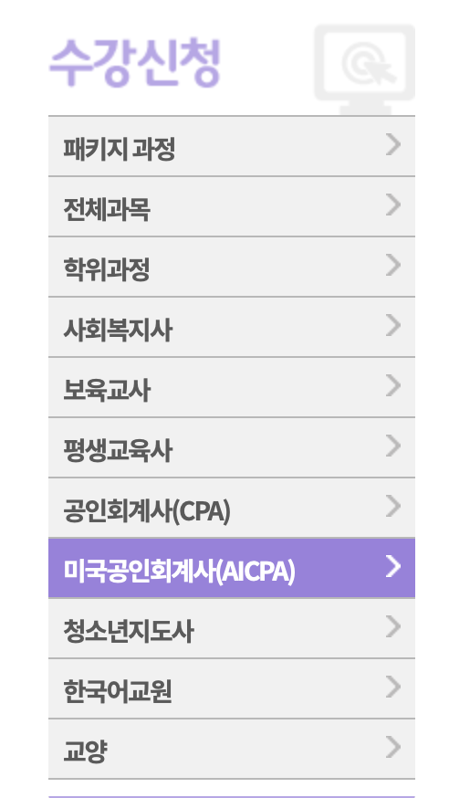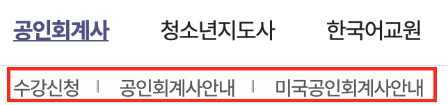 학점 이수를 위한 수강신청은 간단합니다. 공인회계사 메뉴 선택 후 미국 공인회계사 메뉴를 선택하시면 됩니다.