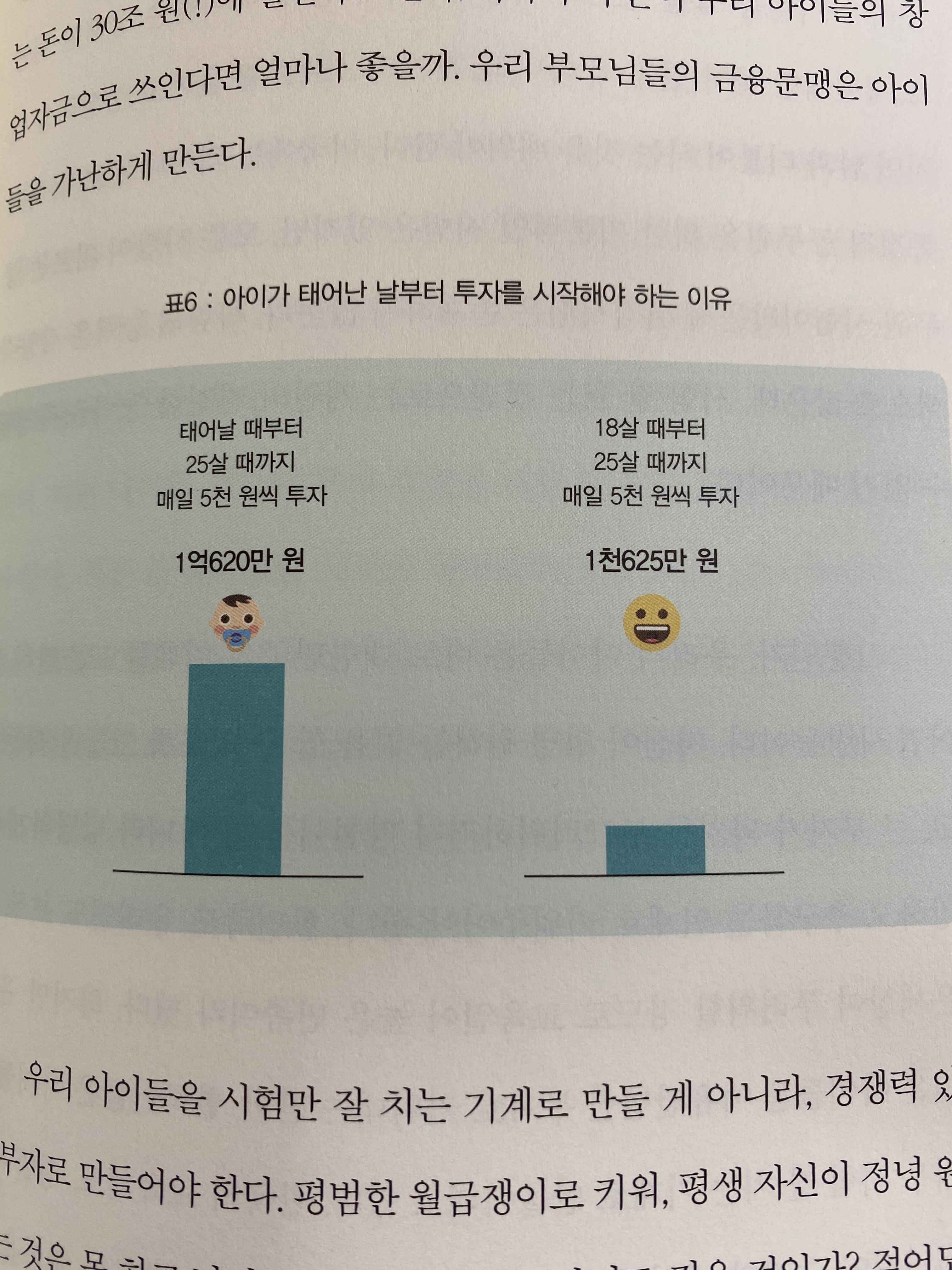 존리가 책에서 강조하는 내용들이 반복적으로 있는데 그 중 하나가 사교육비에 너무 많은 돈을 쓰지 말아라는 것입니다. 엄청난 사교육비를 들여서 좋은 대학 보내봤자 성공하고 부자 된다는 보장도 없고 차라리 그 돈으로 자녀 이름으로 된 주식 통장이나 펀드 통장 만들어 꾸준히 투자하면 20년~30년 뒤에는 큰 수익이 나 있을 거고 그게 바로 자식에게 해 줄 수 있는 좋은 혜택이라는 것입니다.