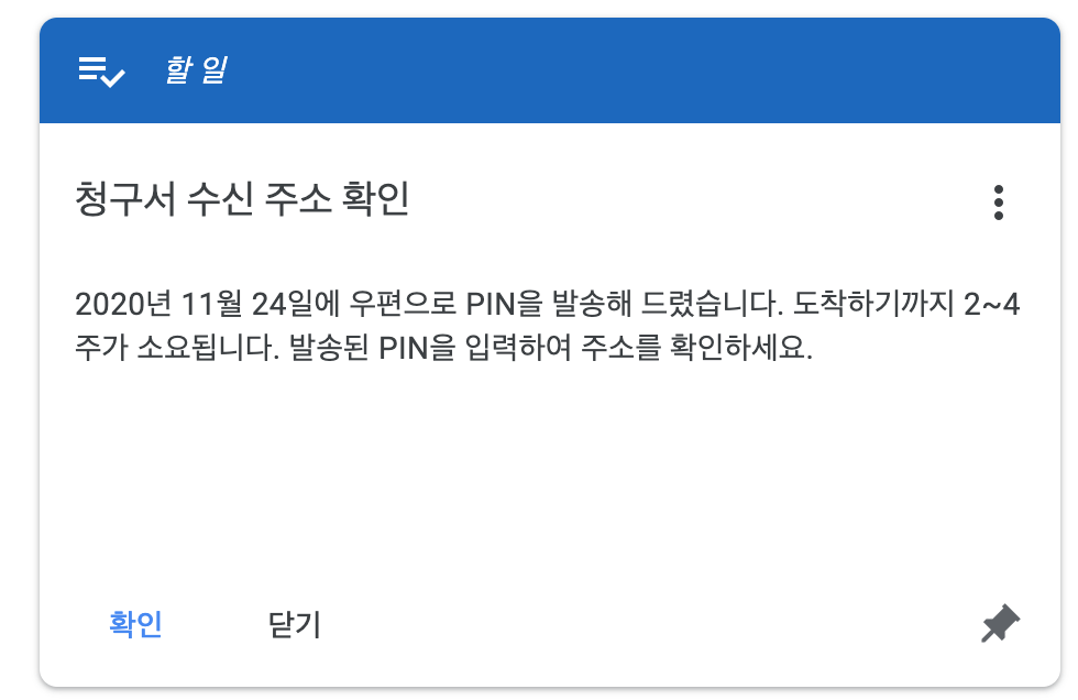 우편에 나와있는 핀 번호 입력 방법처럼 설정에서 주소인증을 찾아보았는데 사실 이 방법은 예전 방법인것 같습니다. 애드센스 메인 화면에 대쉬보드가 있는데 그곳에서 위와 같은 할 일 카드가 있는데 이곳에서 확인 버튼을 눌러 인증이 가능합니다. 핀 번호를 입력할 때 주의하셔야 하는데 총 3번의 시도 동안 정확하게 입력해야합니다. 입력이 실패할 경우 계정이 정지되니 주의하시기 바랍니다. 저도 핀 번호 6자리를 확인하고 또 확인하면서 입력을 했습니다. 이로써 애드센스 승인과 수익금 발생, 그리고 핀 번호 입력까지 이제 지급까지 얼마 안남았습니다.