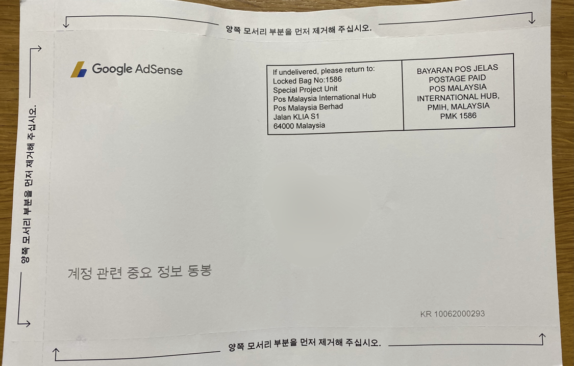 구글 애드센스 핀 번호는 위와 같은 우편으로 받을 수 있습니다. 저는 말레이시아에서 발송이 되었고 약 2달이 걸려서 수령을 했습니다. 핀 번호 발송 후 1달이 지나도 오지 않으면 재발송을 요청할 수 있는데 저는 2개가 같이 왔네요. 위와 같이 핀 번호를 우편으로 수령을 하시고 우편을 열어 보시면 6자리의 핀 번호를 확인할 수 있고 여러차례 요청을 해서 받아도 같은 핀 번호 이므로 어떤것을 입력하셔도 무방합니다.
