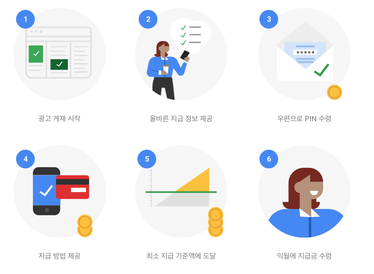 구글 애드센스 수익금을 받기 위해서는 애드고시라고 불리는 애드센스 승인 이후에도 여러가지 절차가 필요합니다. 위 그림처럼 단계별로 진행이 필요하며, 수익금 10달러를 달성하면, 자동으로 핀 번호가 우편으로 발송됩니다. 따라서 애드센스 승인 이후 광고 게재를 시작하고 수익이 생기기 시작하면 구글 애드센스의 계정정보에 입력되어 있는 주소 정보를 정확하게 입력하고 수정해야 합니다. 주소 정보는 구글 애드센스 메뉴에서 지급 -> 설정 -> 설정관리 -> 결제 프로필에서 수정이 가능합니다.