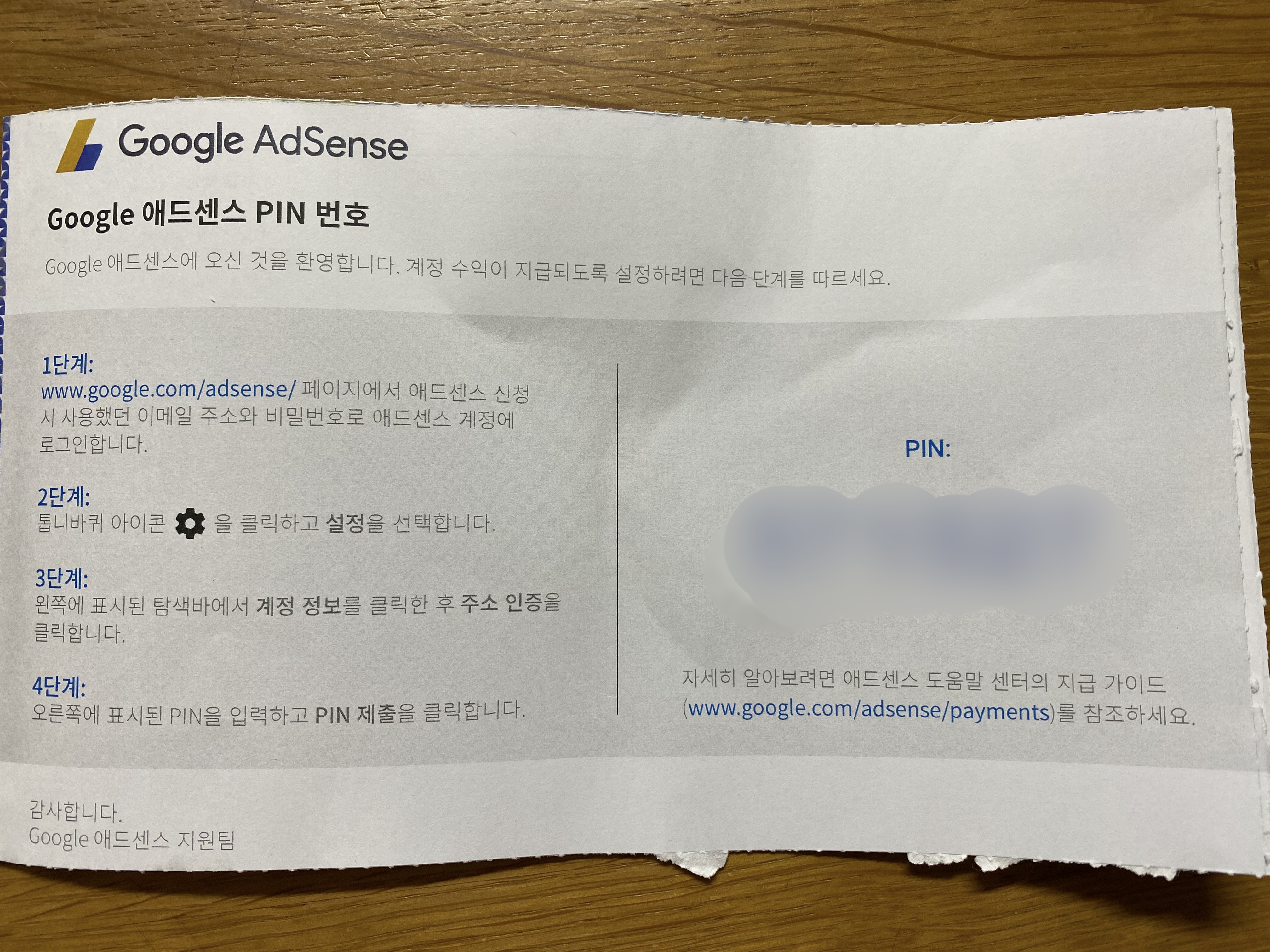 구글 애드센스 핀 번호는 위와 같은 우편으로 받을 수 있습니다. 저는 말레이시아에서 발송이 되었고 약 2달이 걸려서 수령을 했습니다. 핀 번호 발송 후 1달이 지나도 오지 않으면 재발송을 요청할 수 있는데 저는 2개가 같이 왔네요. 위와 같이 핀 번호를 우편으로 수령을 하시고 우편을 열어 보시면 6자리의 핀 번호를 확인할 수 있고 여러차례 요청을 해서 받아도 같은 핀 번호 이므로 어떤것을 입력하셔도 무방합니다.
