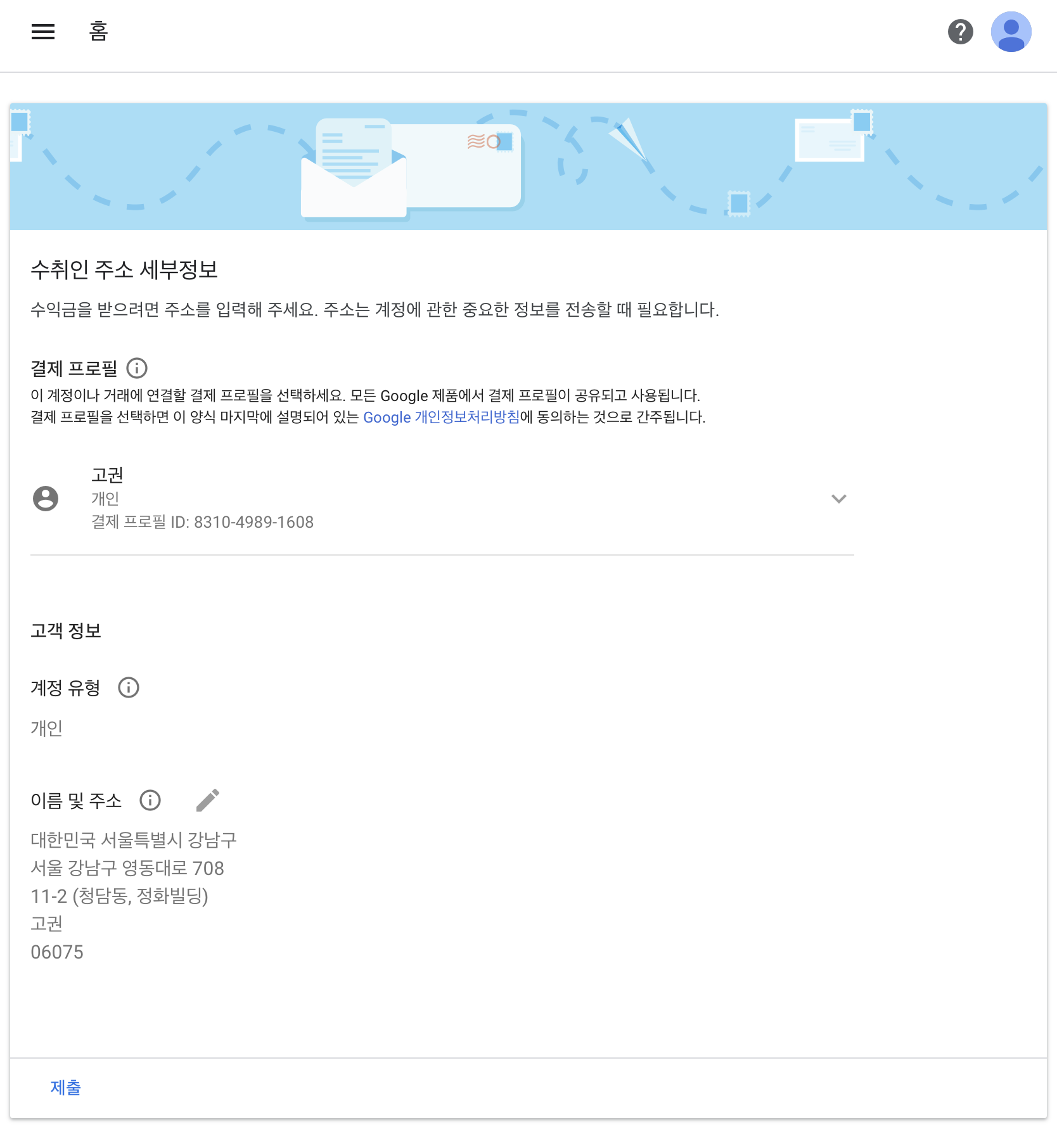 그리고 나오는 화면은 수취인에 대한 세부정보 입니다. 이 화면은 구글 애드센스를 통해 수익을 창출할 수 있기 때문에 계정의 세부정보를 입력하여 추후 지급에 대해 확인하기 위함인데 본인의 이름 및 주소를 정확히 입력해주시면 됩니다.