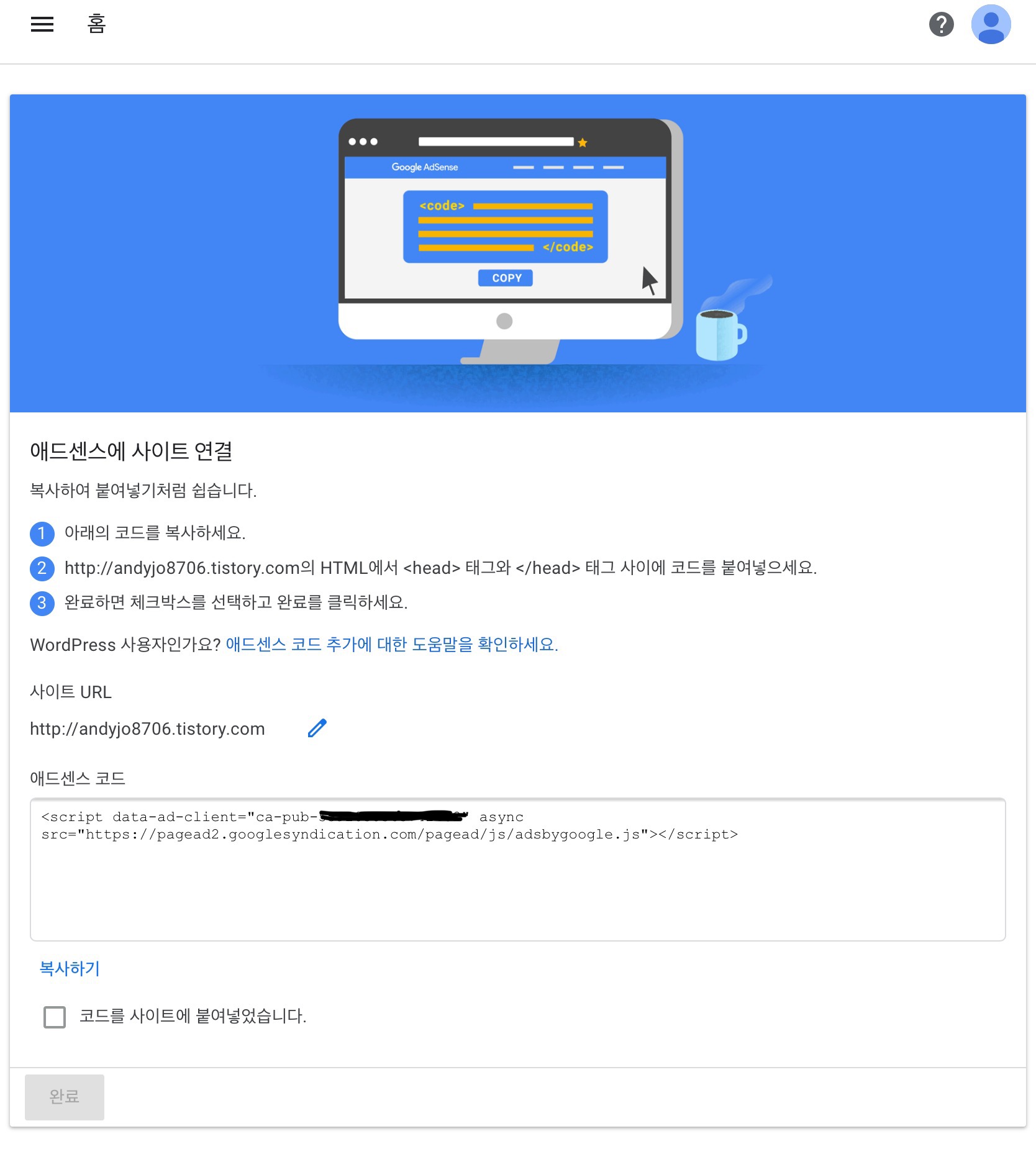 이렇게 티스토리 블로그에 위 애드센스 코드를 삽입 후 적용을 눌러 주신 후 다시 구글 애드센스 홈페이지로 돌아와서 코드를 사이트에 붙여 넣었습니다. 라는 체크 박스를 체크 후 완료를 눌러 주시면 됩니다.