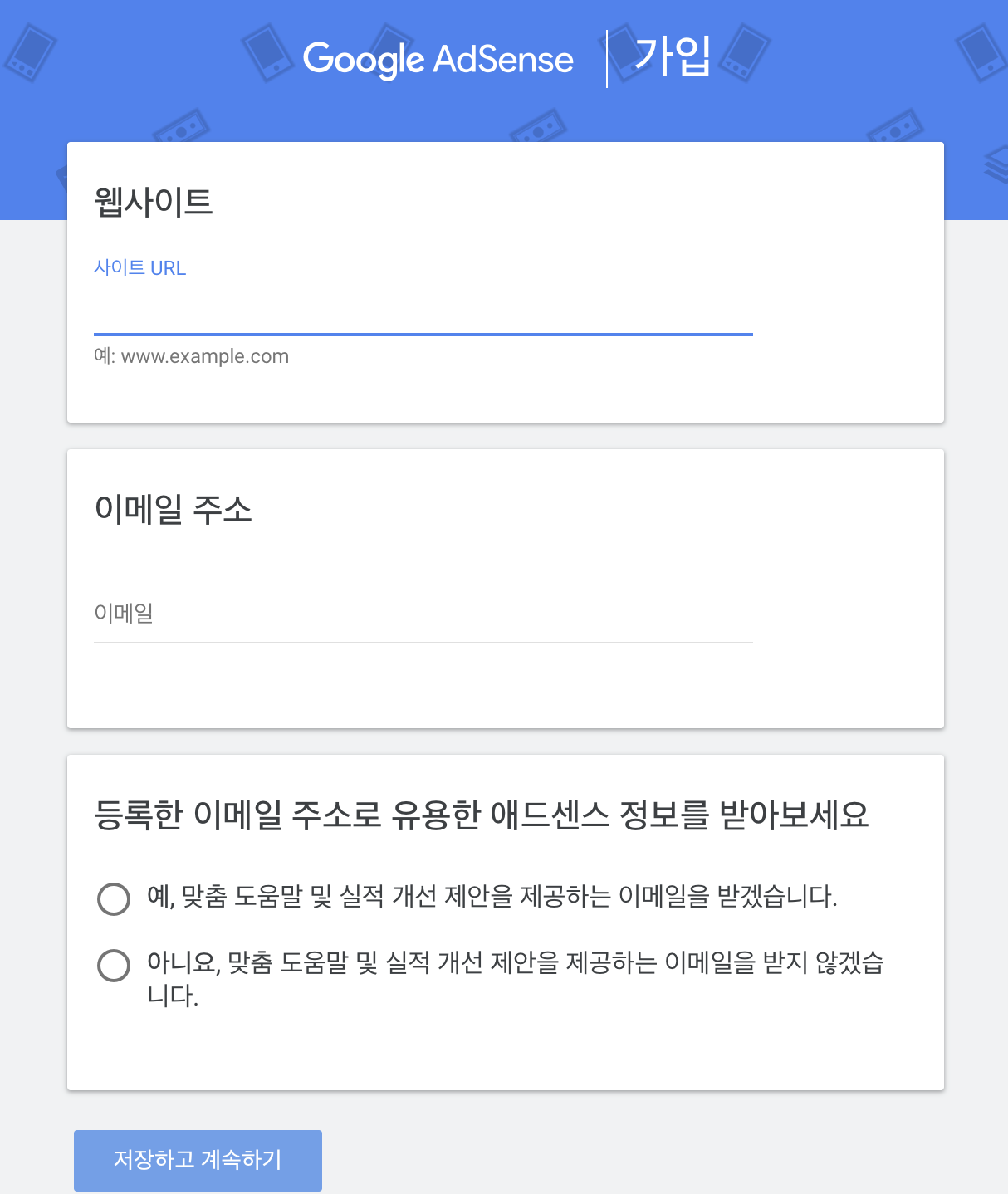 구글 애드센스(Goolge AdSense)에 들어가시면 위와 같이 애드센스를 가입하는 화면을 보실 수 있습니다. 여기에 구글 애드센스를 게재하고 싶은 웹사이트와 이메일 주소, 그리고 정보 수신 여부를 체크하시면 됩니다.