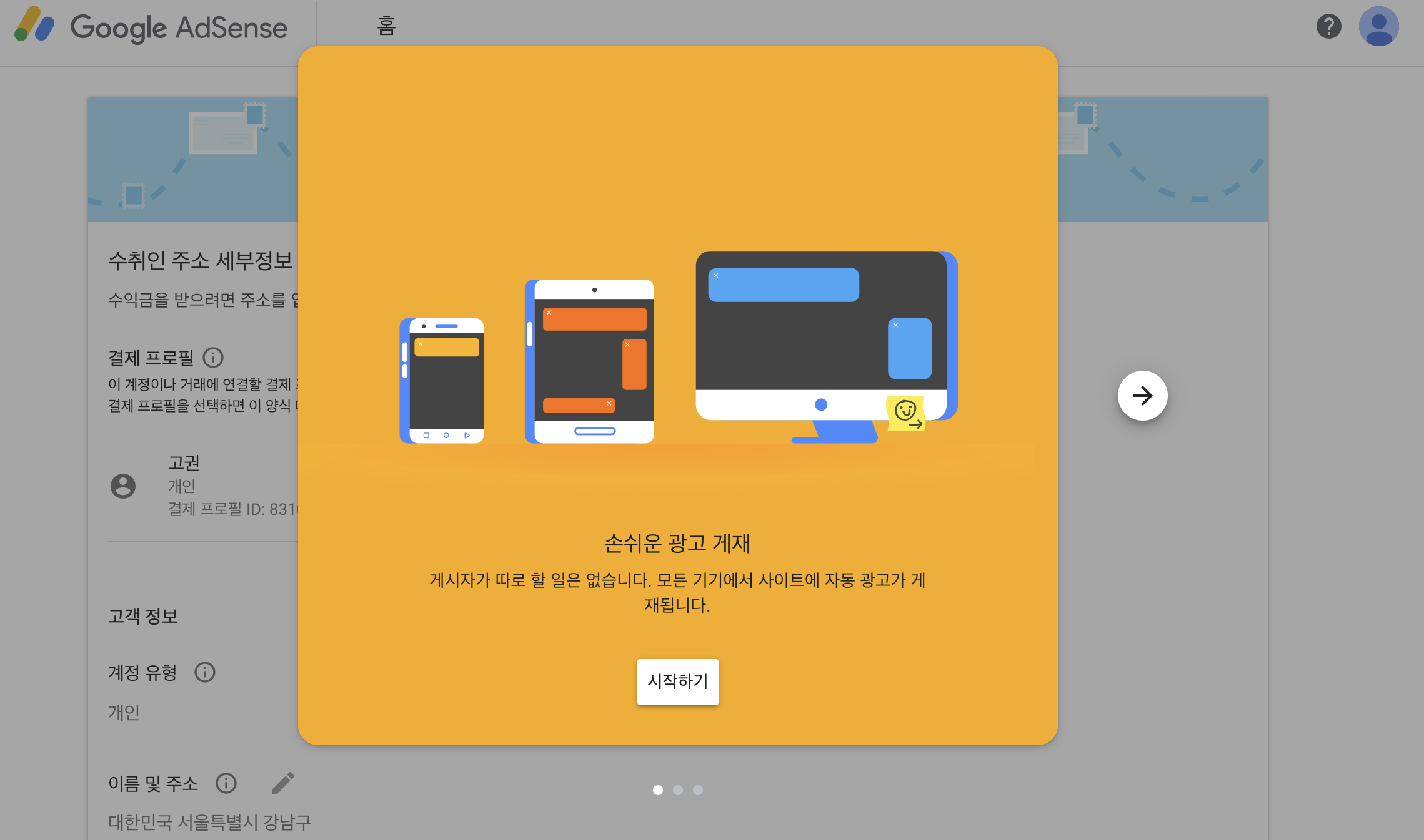 구글 애드센스의 손쉬운 광고 게재에 대한 안내를 받고