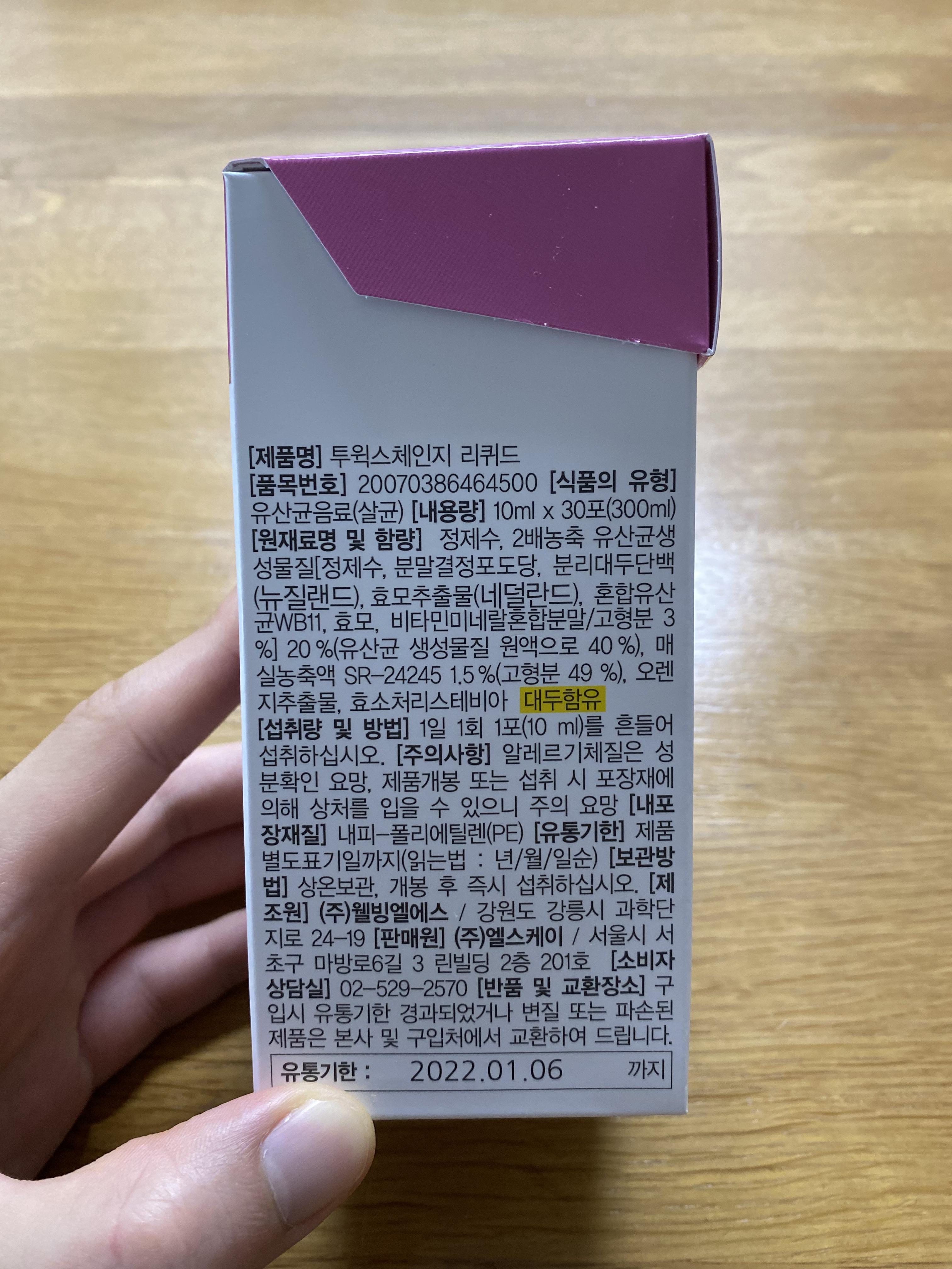 와이프가 병원 진료 후 약국에 가서 추천 받은 유산균 생성물질은 엘스케이라는 회사의 투윅스 체인지 리퀴드라는 제품이었습니다. 별도로 광고나 협찬을 받은건 아니고 저희가 직접 구입한 제품이며, 자세한 내용은 약국을 방문해서 약사와 상의후 구입하시기 바랍니다. 개인적으로 지금 해당 제품을 먹은지 1주일 정도 된것 같은데 다른건 모르겠지만 배변 활동이 예전보다 조금 더 원활하게 그리고 건강해진것 같습니다. 이 제품을 섭취하면서 음식 조절도 같이 해서 그런 효과가 있는지 모르겠지만, 유산균과 유산균 생성물질을 동시에 먹고 있는데 생각보다는 효과가 좋은 것 같아서 만족하고 있습니다.
