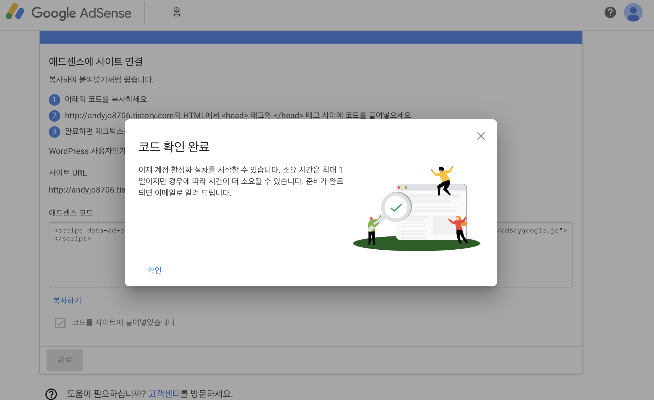 이렇게 티스토리 블로그에 위 애드센스 코드를 삽입 후 적용을 눌러 주신 후 다시 구글 애드센스 홈페이지로 돌아와서 코드를 사이트에 붙여 넣었습니다. 라는 체크 박스를 체크 후 완료를 눌러 주시면 됩니다.