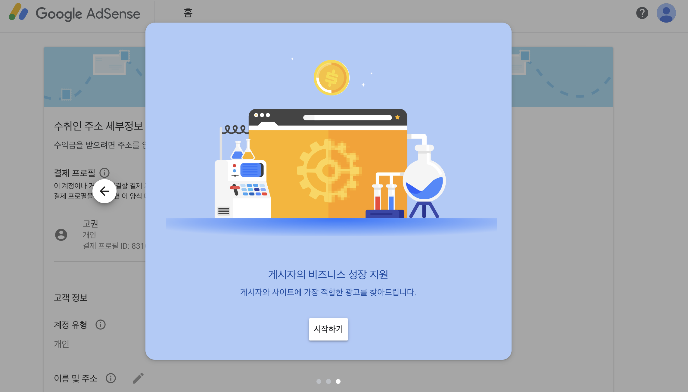 가장 적합한 광고를 제공한다는 안내문을 끝으로 애드센스 계정을 시작할 수 있습니다.