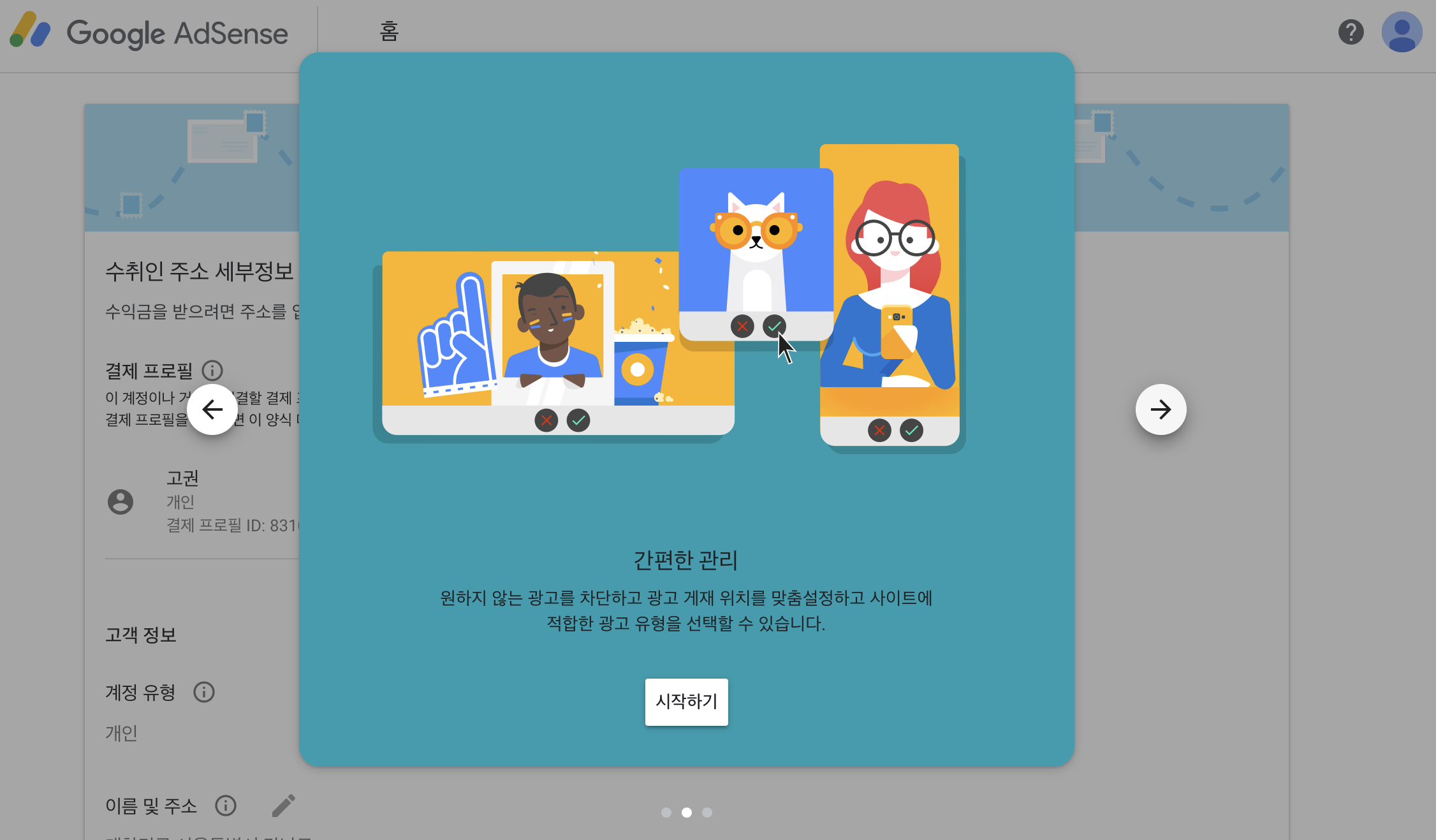 구글 애드센스의 손쉬운 광고 게재에 대한 안내를 받고