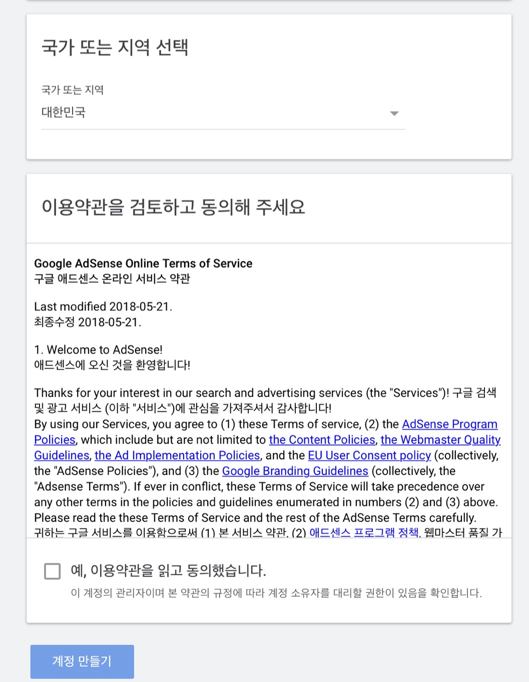 그리고 위와 같은 화면에서 국가와 이용약관을 읽어보시고 동의하시면 구글 애드센스 계정 만들기를 하실 수 있습니다.