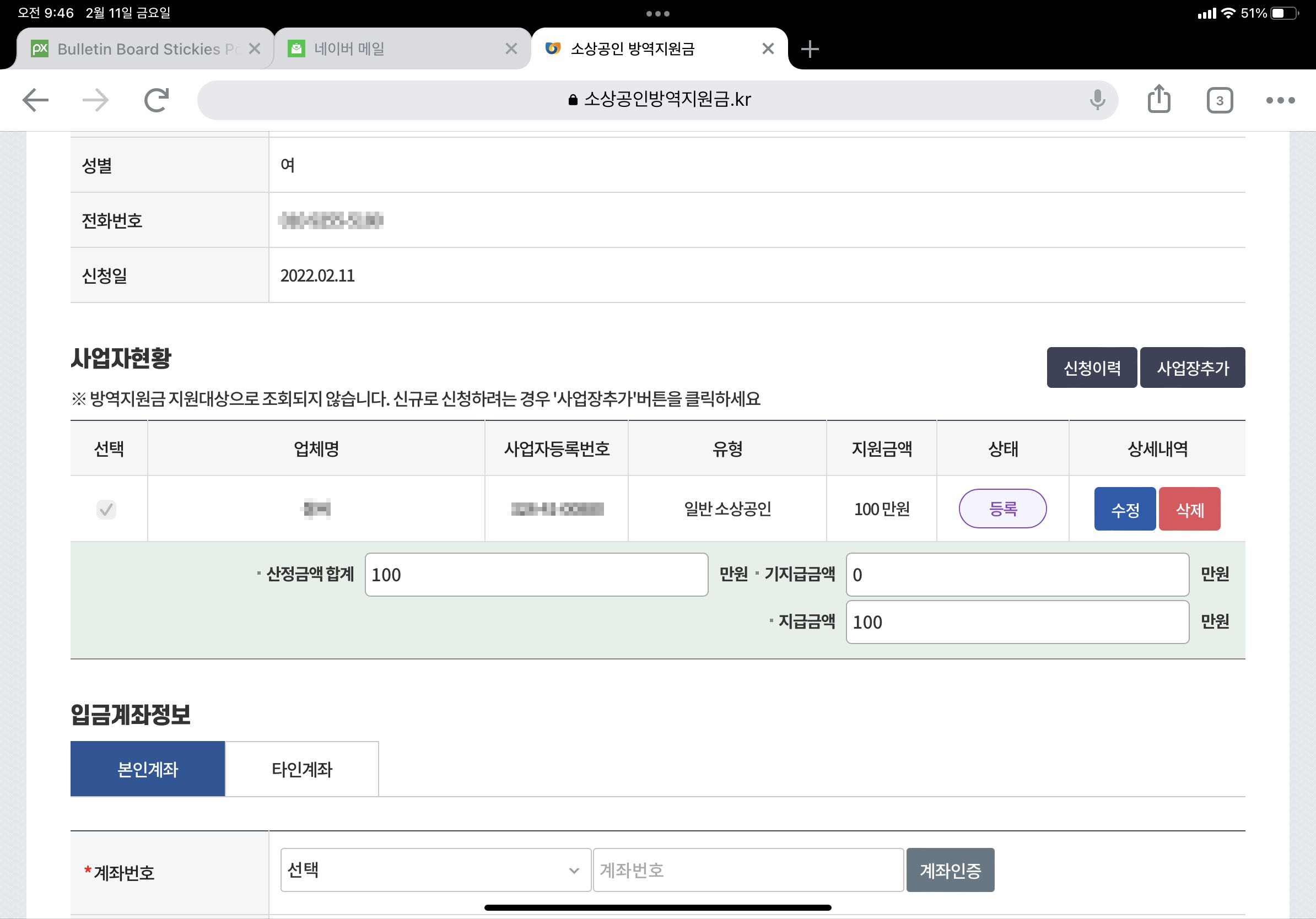 모든 서류를 PDF파일로 업로드하고 신청완료를 누르면 위의 화면과 같이 사업자 현황이 나오게 됩니다. 신청일과 상태 및 입력한 상세내역을 수정할 수 있는데 저 상태가 현재는 등록 완료로 나오고 있는걸 봐서는 기본적인 정보가 제대로 입력은 된것 같습니다. 이제 해당 서류에 대한 검토 후에 대상여부가 결정되고 대상 조건에 충족한다면 지급이 될것 같네요.