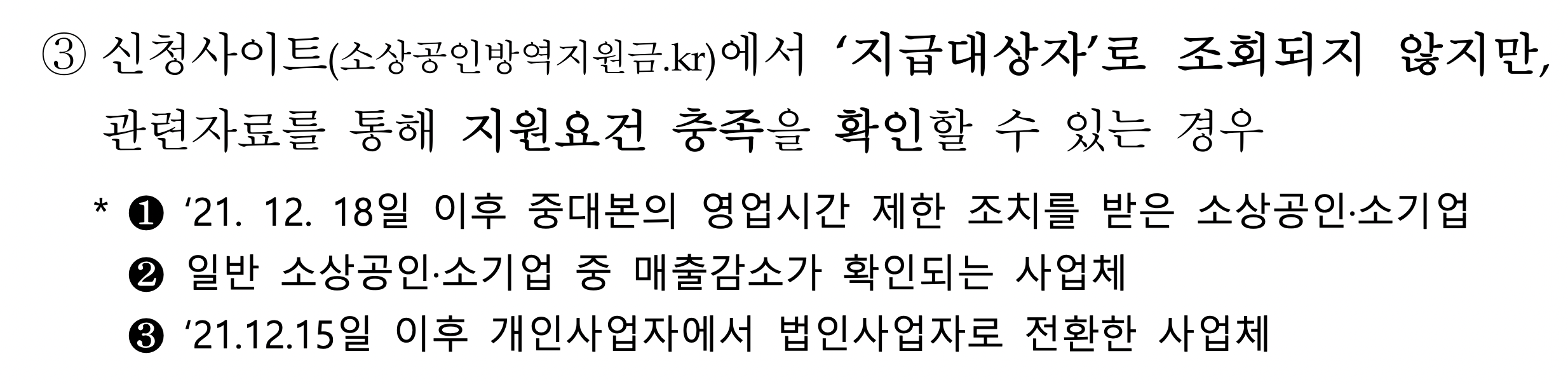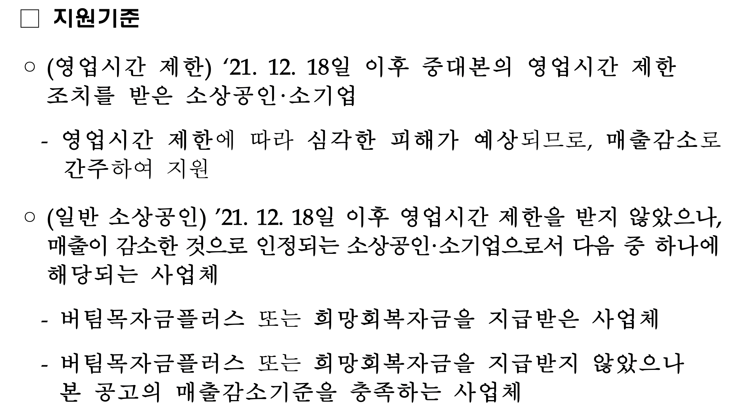 지원기준은 영업시간 제한으로 인한 매출감소가 확인되는 경우, 긜고 영업시간 제한을 받지는 않았으나, 매출이 감소한 것으로 인정되는 소상공인 및 소기업으로 버팀목자금플러스 또는 희망회복자금을 지급받은 사업체나, 이 지원을 받지는 않았으나, 매출감소 기준을 충족하는 사업체는 가능합니다.