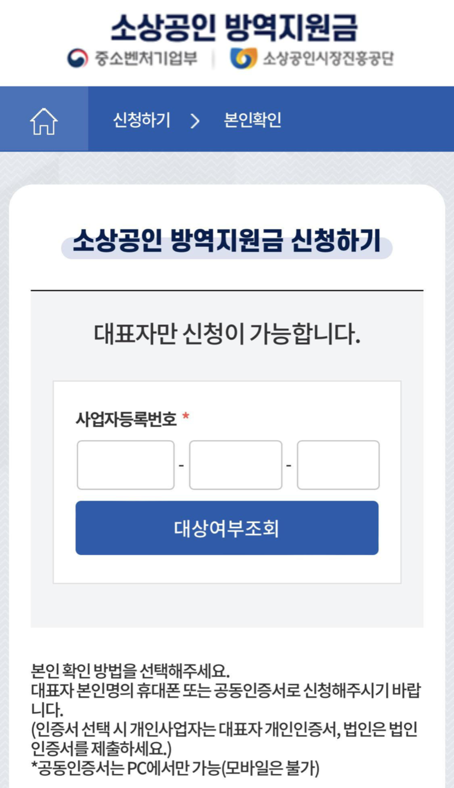 모바일로 신청하실 때 주의하실점은 공동인증서로 본인 인증은 모바일로는 불가하여 휴대폰으로 인증을 하셔야 한다는 점입니다. 저는 사실 제 명의로 사업자등록을 한 것이 아니라 와이프 명의의 사업자등록번호를 가지고 신청을 진행했기 때문에 인증 시에 와이프의 휴대폰으로 인증번호를 받는 등 다소 번거로웠지만, 모바일로도 간편하게 신청이 가능하니 서둘러 신청해서 지원금 받으셨으면 좋겠네요.