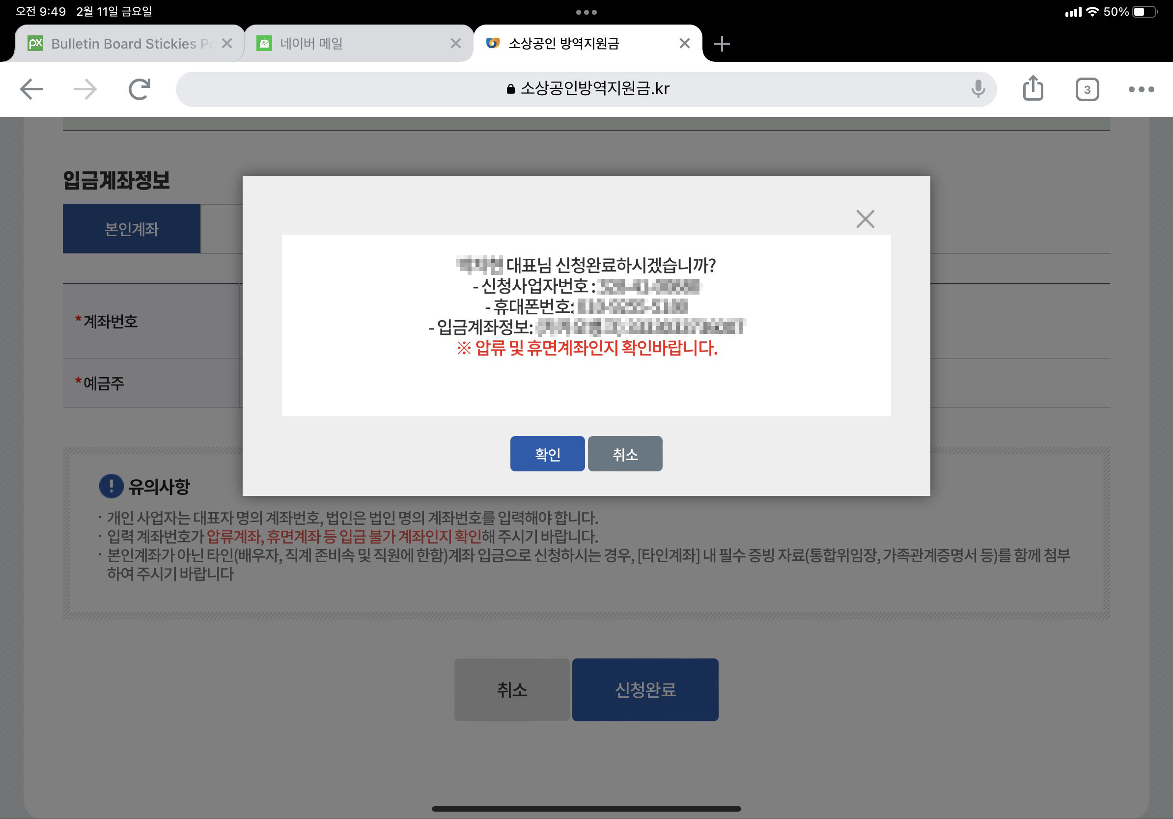 모든 정보를 입력하고 사업자 대표의 은행 계좌 정보를 넣으면 위와 같이 최종적으로 신청 완료에 대한 확인 후에 신청 완료가 되게 됩니다. 휴면 계좌나 압류 계좌는 등록이 불가하다고 하니, 사업자 대표의 계좌 번호를 정확하게 입력하시기 바랍니다.