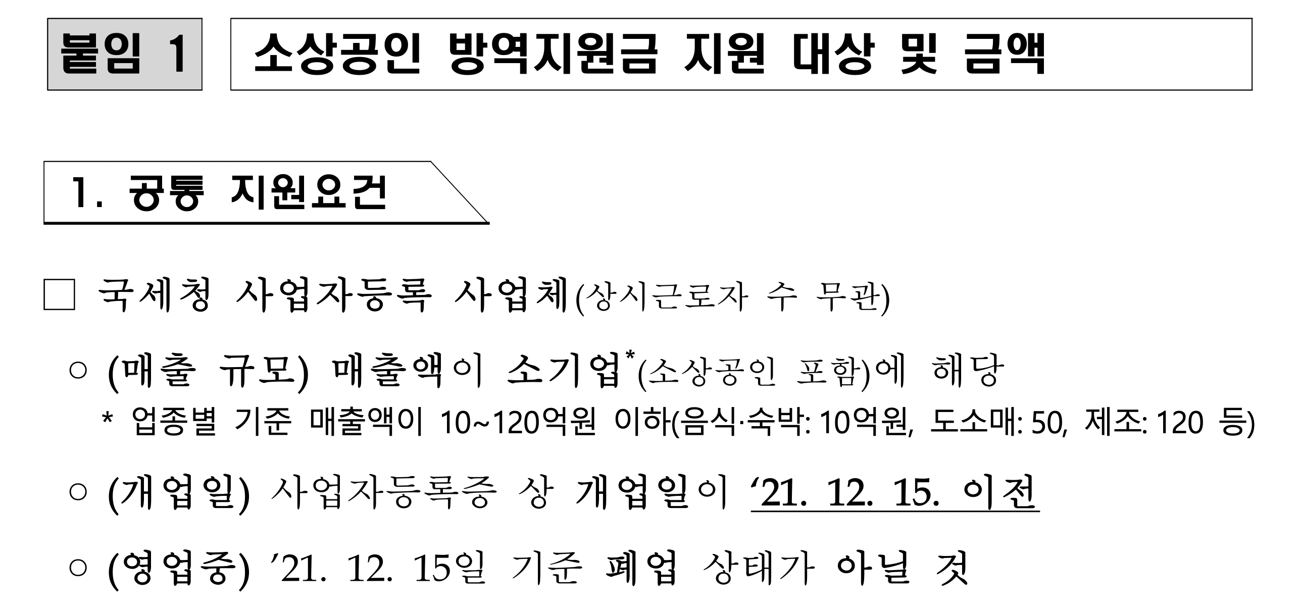 이번에 소상공인 방역지원금을 받을 수 있는 지원 대상은 국세청에 사업자등록이 되어 있는 사업체이면서 소상공인을 포함한 매출액이 업종별 10~120억 이하의 업체입니다. 또한 개업일이 사업자등록증 상 '21년 12.15 이전인 사업체이어야 하며 동시에 해당일 기준 폐업 상태가 아니어야 합니다.
