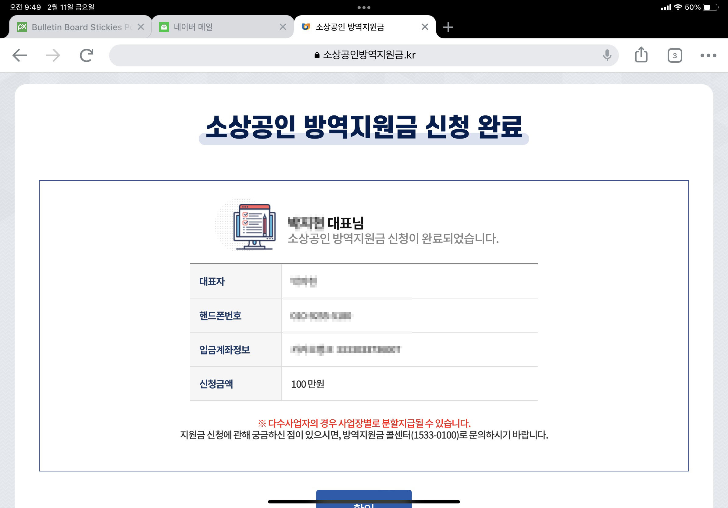 최종적으로 등록을 마치면 위와 같이 소상공인 방역지원금 신청 완료 화면을 확인할 수 있습니다. 대표자 정보와 신청금액을 다시 한번 확인 하시고 지급이 되는지 지속적으로 상태를 확인하시면 될것 같네요.