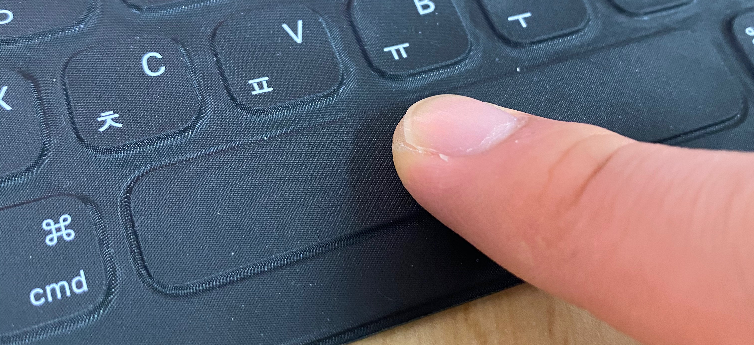 눌리는 정도가 크지는 않고 딱딱딱 기분 나쁘지 않게 칠 수 있는 키감입니다. 소음도 크지 않아서 조용한 곳에 천천히 타이핑하면 충분히 소음 없이 가능할 수 있을 것 같습니다.