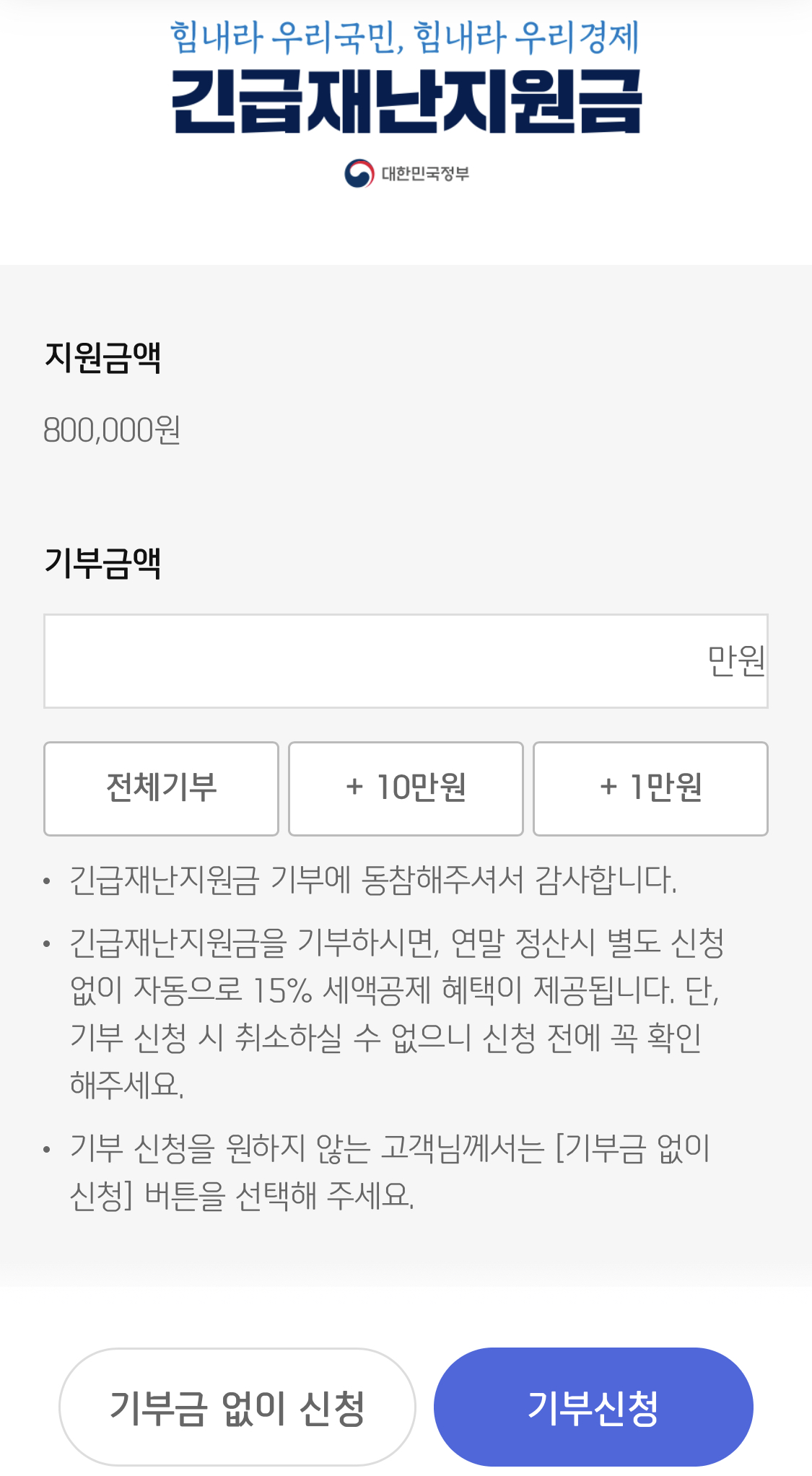 참 말도 많고 쟁점도 있는 부분입니다. 고소득자들에게도 지원금을 주는 것이 맞는가? 원안은 국민의 70%정도가 혜택을 받을 수 있도록 상위 30%는 제외하였습니다. 하지만 선정 기준 및 역차별 논란 등에 따라 전국민 지급으로 바뀌었는데 어마어마한 세금 부담을 떠 앉게 되었습니다. 그나마 자발적 기부를 할 수 있는 방안을 마련하여 보다 어려운 사람들을 돕고 기부 참여를 위해 연말정산 시 15% 세액공제 혜택을 주고 있습니다. 과연 어떤 방안이 현 경제위기를 타파하고 미래 세대에게도 부담이 적은 방법이었을까요?