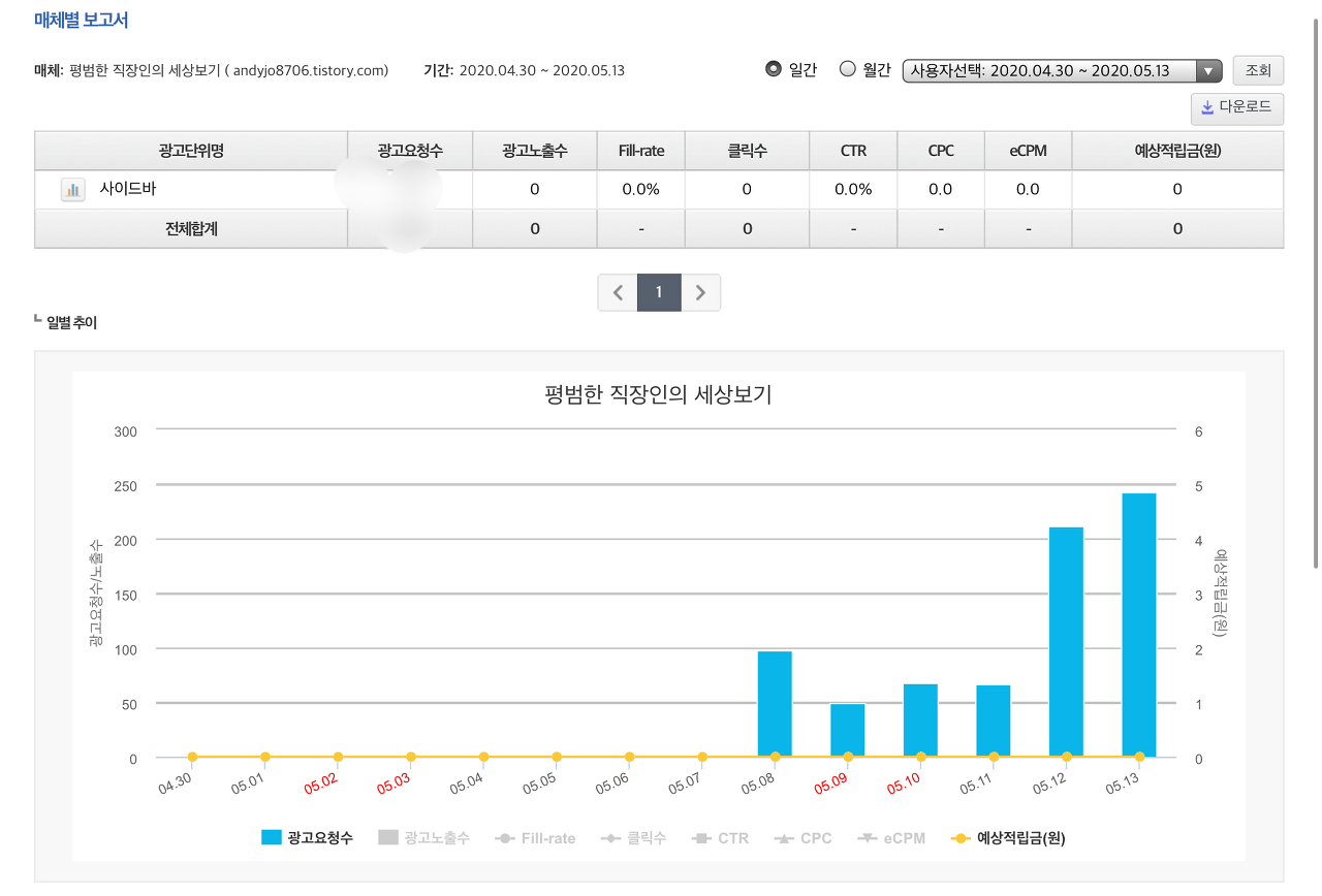 애드핏 승인 후 바로 애드핏에 들어갔더니, 이제 광고단위 당 노출 수와 적립금을 확인할 수 있었습니다. 당연히 오늘 승인이 났기 때문에 수익은 없고, 제가 신청한 날 이후부터 광고 요청이라고 해서 광고게재 요청을 한 횟수가 있었습니다. 아마도 제대로 승인이 났다면 보다 많은 노출수를 확보할 수 있었을텐데 아쉬움이 많이 남습니다. 앞으로 찬찬히 포스팅 갯수를 늘려갈 예정이고 그에 따라 어떻게 광고 수익이 생기는지도 차차 공유하도록 하겠습니다. 노출수나 클릭수, CTR, CPC, eCPM 등 다양한 개념들을 이해하고 실험도 해봐야 할 것 같습니다.