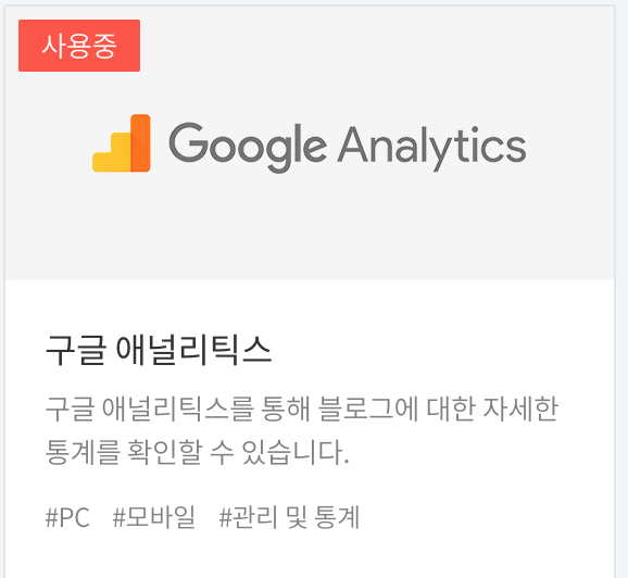 구글 서치 콘솔과 마찬가지로 티스토리 관리자 모드에서 플러그인 모드로 들어가면 구글 애널리틱스 플러그인을 찾으실 수 있습니다.