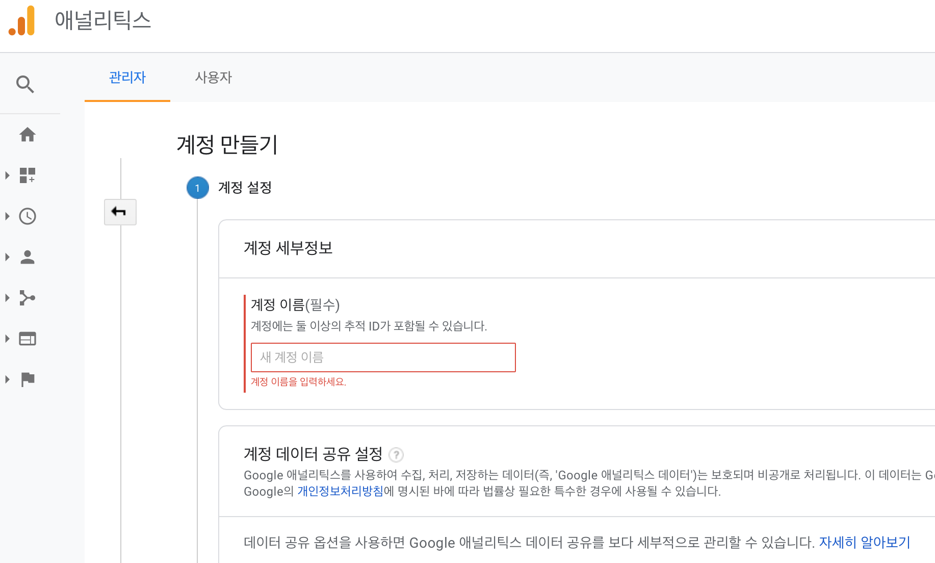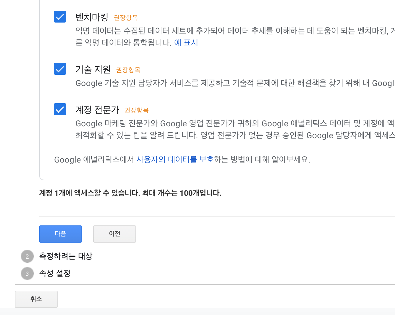 이곳에서 구글 애널리틱스에서 사용할 계정이름을 입력하고 아래에 있는 설정 관련된 내용들을 확인하고 다음 버튼을 눌러줍니다. 아래 설정 관련해서는 구글에서 모두 권장하는 항목으로 저는 전부 체크하고 넘어가시는 것을 추천합니다.