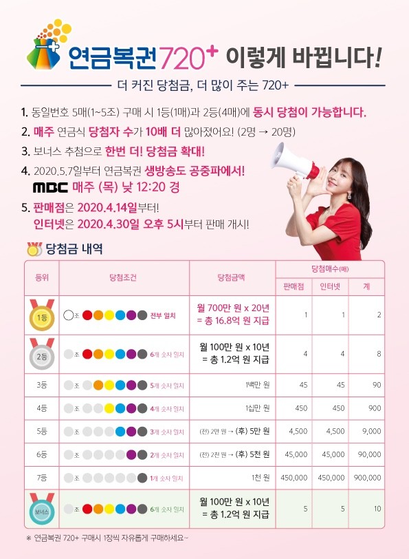 (유통시간 등의 이유로 판매점에서는 이미 4월 14일부터 판매중이니, 판매점에서 구입하실 분들은 참고하세요.) 이 밖에 추첨일 및 방송시간도 변경되며 첫번째 추첨은 5월 7일입니다. 이번 연금복권 720+의 출시로 자연스럽게 기존 연금복권은 4월 29일(수) 마지막 추첨을 끝으로 폐지 수순을 밟게 됩니다.