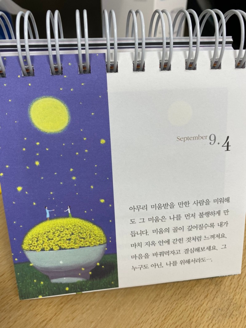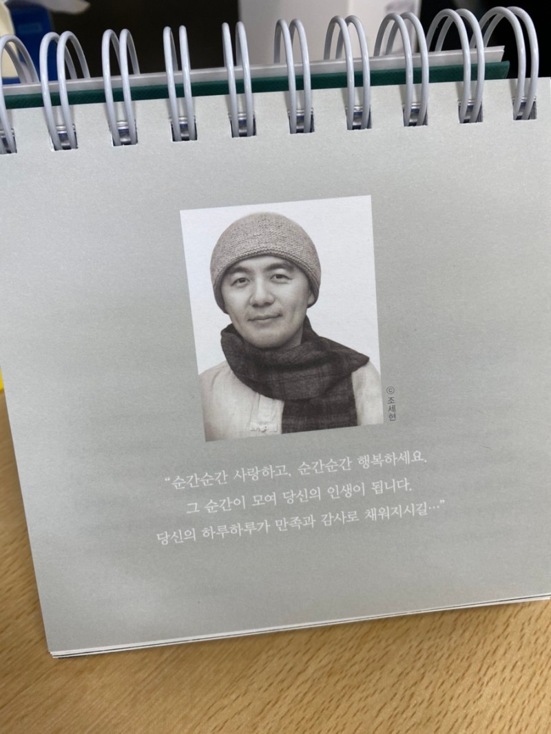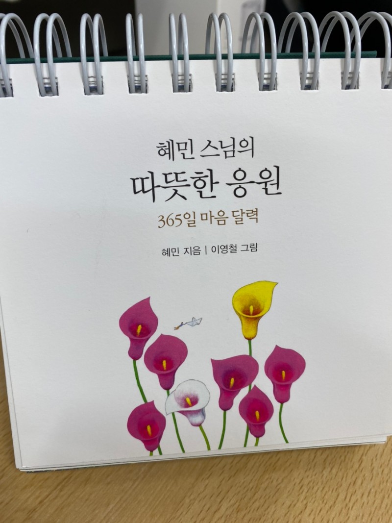 저는 올해 초 와이프한테 작은 선물을 하나 받았습니다. 바로 혜민 스님의 따뜻한 응원 - 365일 마음 달력입니다. 이 달력은 특이하게도 연도와 요일이 없어 언제든지 사용이 가능한 달력입니다.