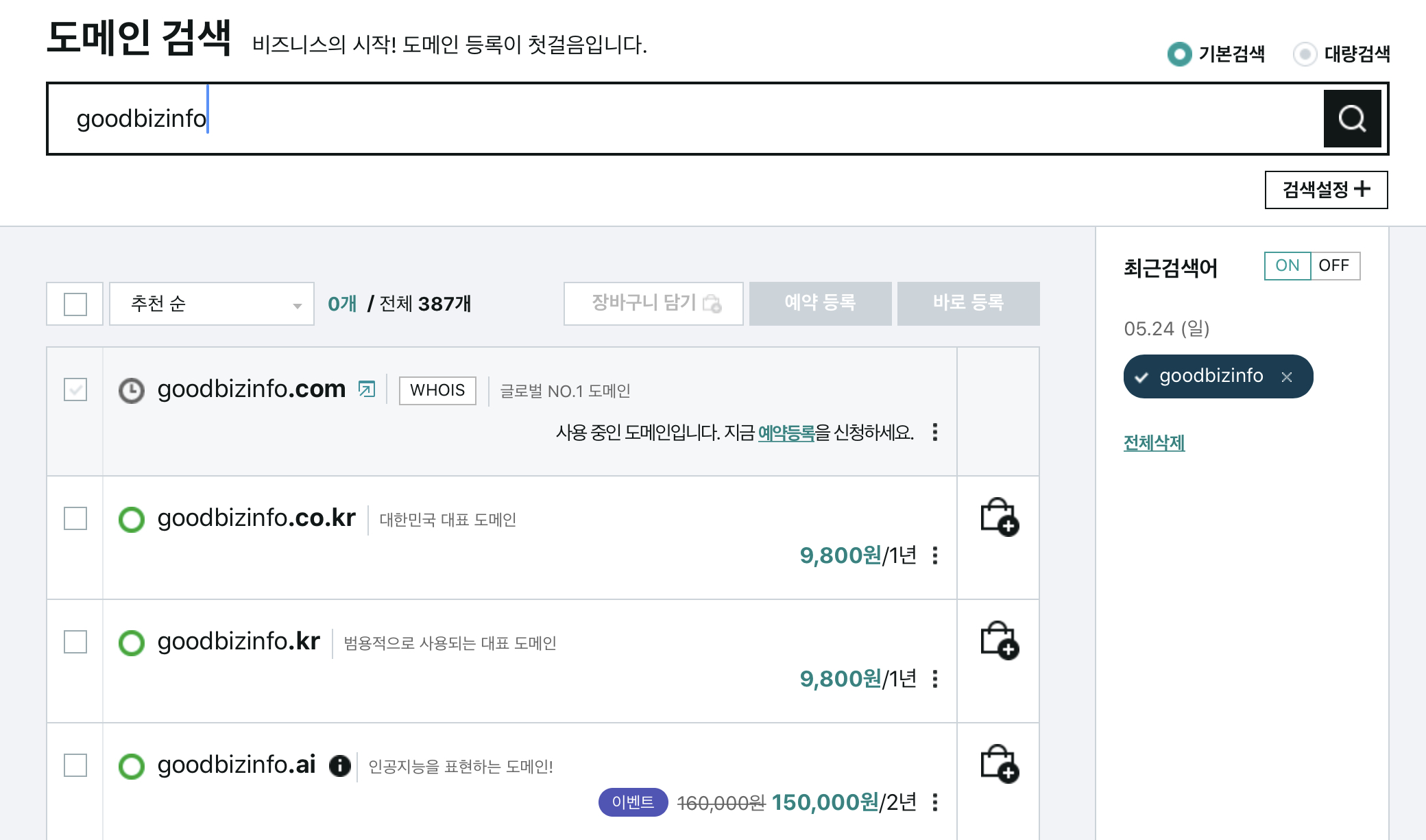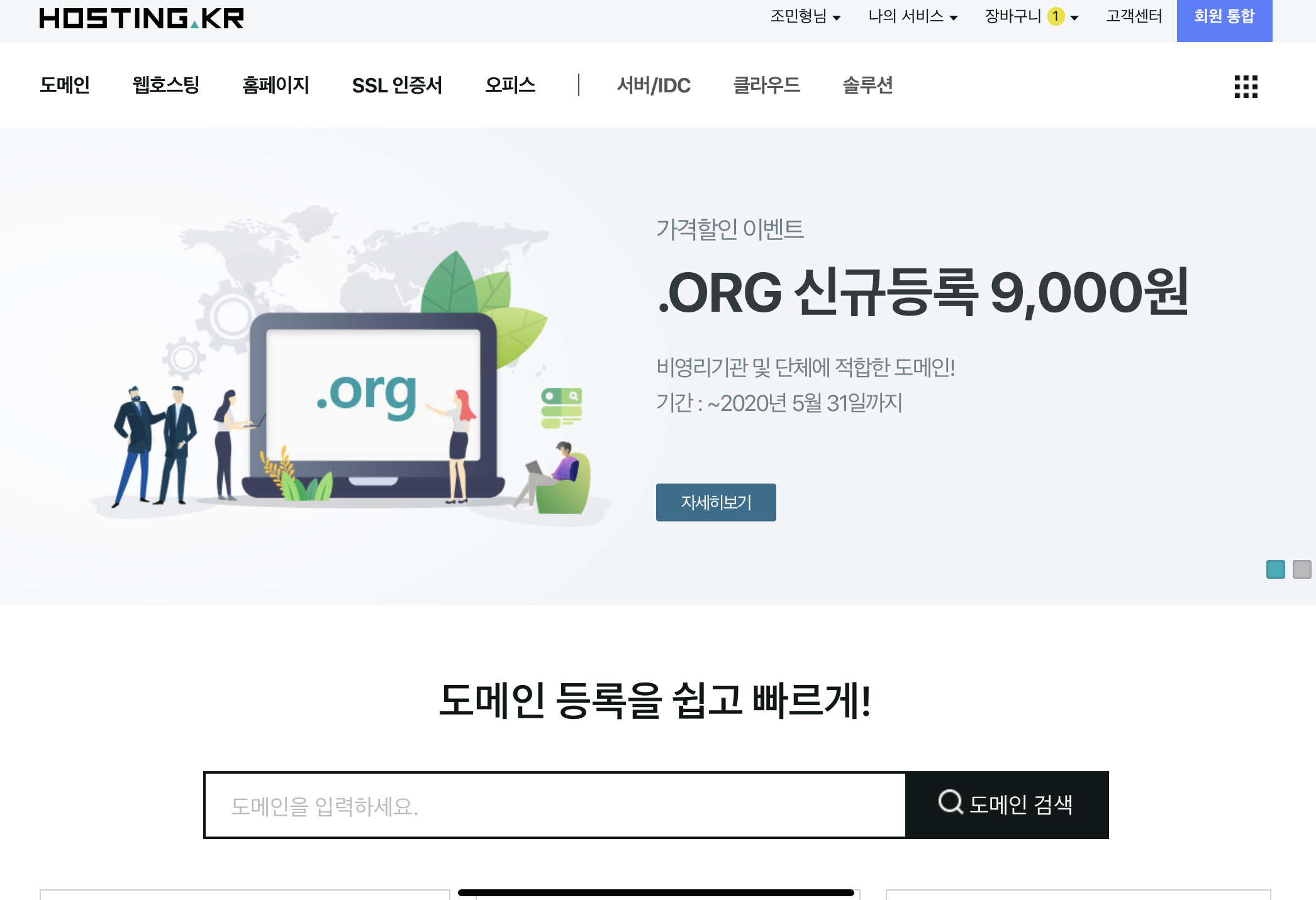 호스팅 케이알 홈페이지에 접속하면 위와 같은 화면을 보실수 있습니다. 여기에 도메인 검색을 할 수 있는 곳에서 본인이 사용하고 싶은 도메인 주소를 넣어서 검색을 해봅니다. 저는 goodbizinfo라고 검색을 해봤습니다.