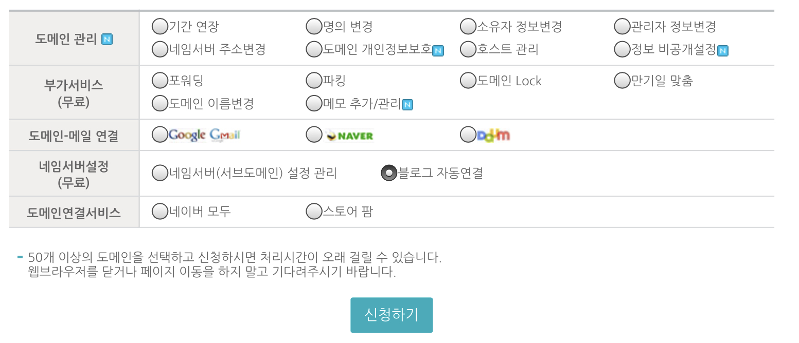 블로그 자동 연결을 선택하시면 위와 같이 연결값이라는것이 나오게 되는데 저 연결값이 티스토리와 개인 도메인을 연결할 수 있는 주소가 됩니다. 여기에서 신청하기 버튼을 누르시면 호스팅케이알에서 티스토리 블로그를 연결 할 수 있는 설정을 진행하게 됩니다. 그 후 티스토리 관리자 메뉴로 들어와서 연결 설정만 하면 개인 도메인 연결은 끝이 납니다.
