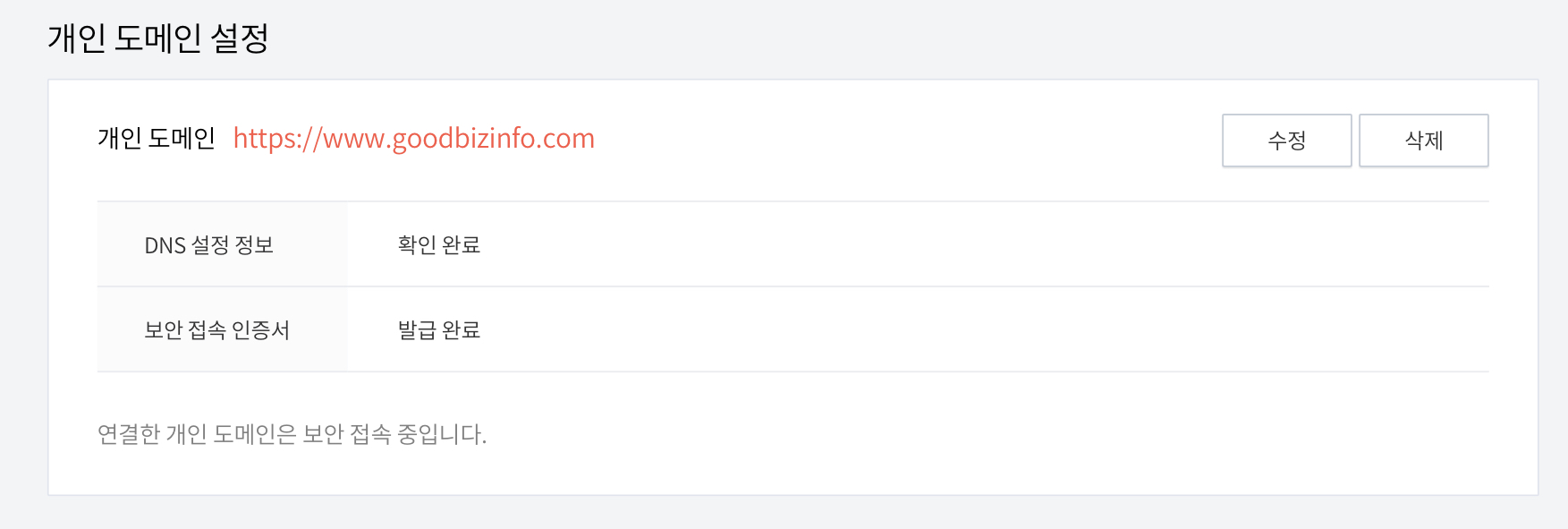 개인 도메인 설정에 들어오셔서 개인 도메인을 입력해주시고, 위의 호스팅 케이알에서 제대로 설정이 되셨다면 위와 같이 보안 접속 인증서까지 발급 완료 되었다는 설정을 확인하실 수 있을겁니다.