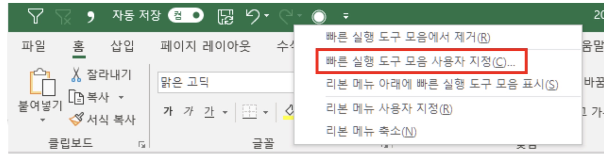 그러면 위의 그림처럼 “빠른 실행 도구 모음 사용자정”이라는 메뉴를 확인할 수 있습니다. 이 메뉴는 이 리본 메뉴 영역에 자신이 추가하고 싶은 기능을 추가하여 단축키로 설정할 수 있는 기능을 제공합니다.