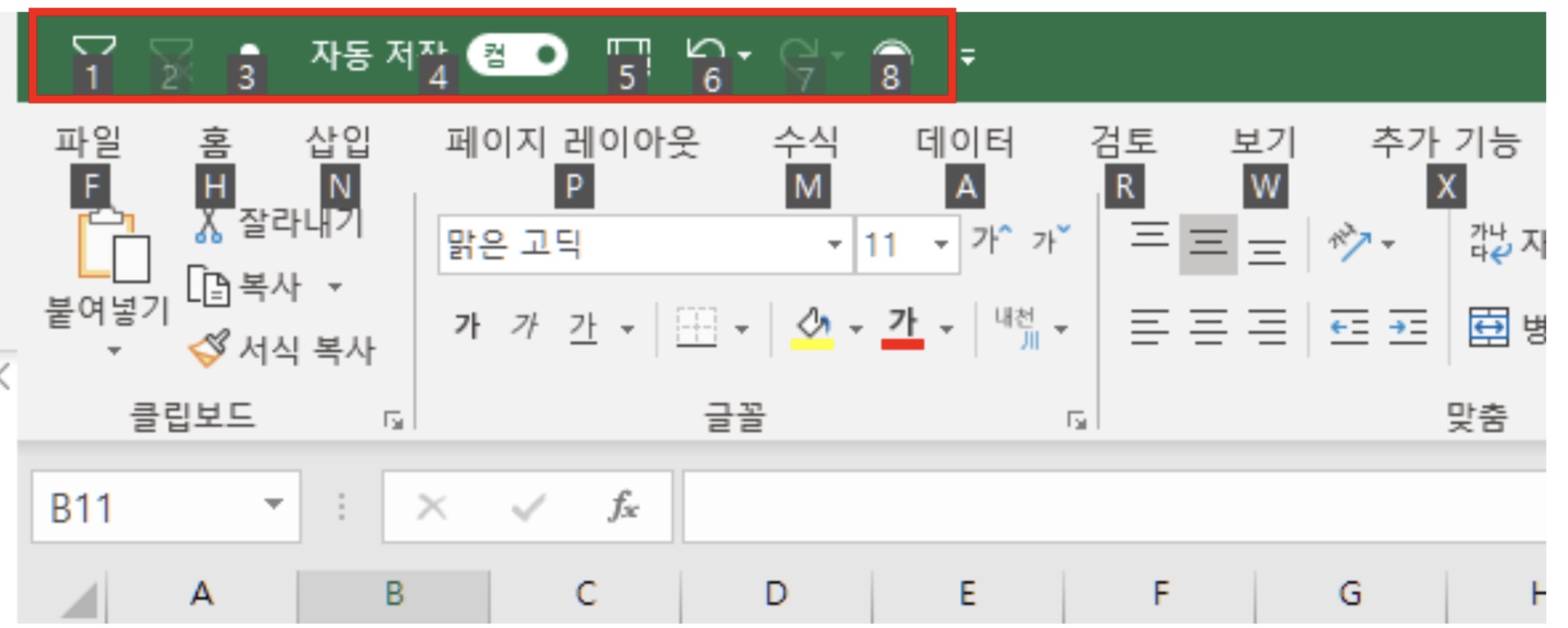 그러면 위의 그림처럼 “빠른 실행 도구 모음 사용자정”이라는 메뉴를 확인할 수 있습니다. 이 메뉴는 이 리본 메뉴 영역에 자신이 추가하고 싶은 기능을 추가하여 단축키로 설정할 수 있는 기능을 제공합니다.
