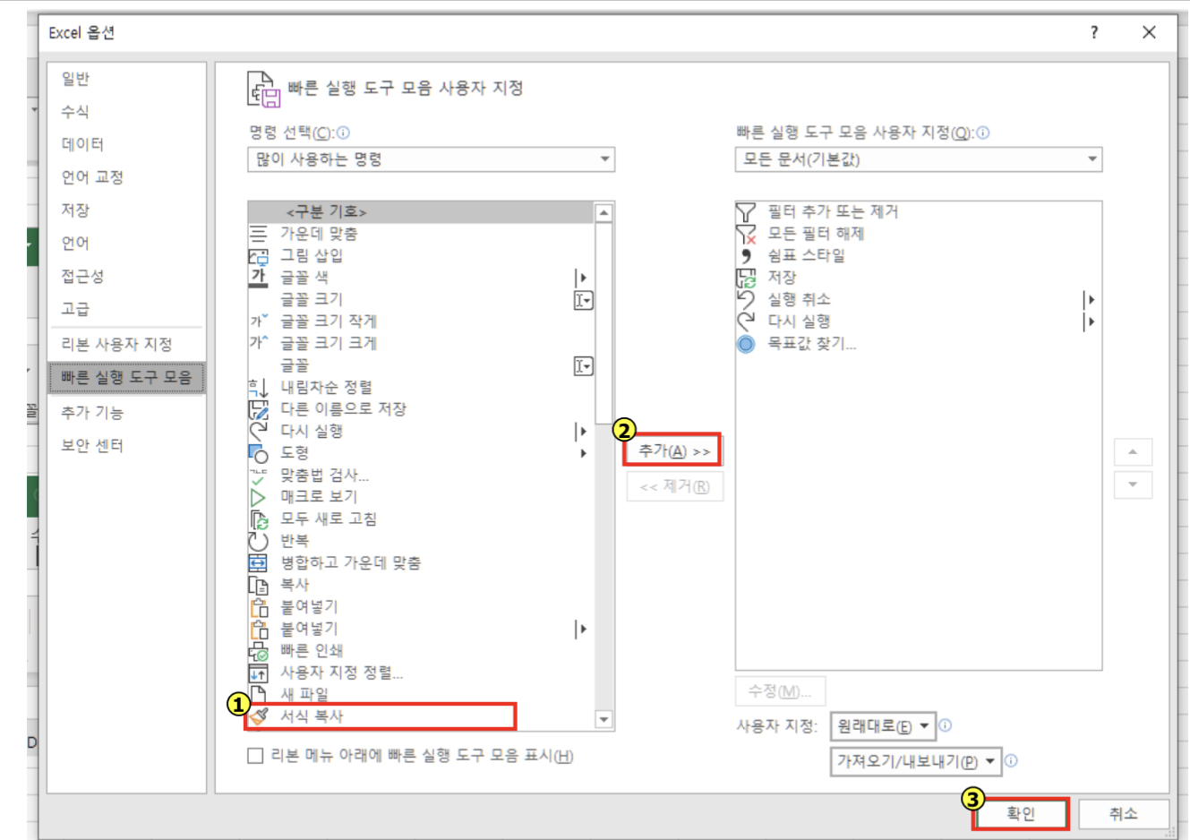 빠른 실행 도구 모음 사용자 지정을 실행하면 위와 같은 화면이 나오게 됩니다. 이 화면에서는 엑셀에서 사용할 수 있는 기능들을 확인할 수 있는데 왼쪽 상단에 명령 선택 탭을 통해 자신이 사용하고자 하는 기능이 포함되어 있는 탭을 선택하여 바로 기능을 추가할 수도 있습니다. 설정 방법은 굉장히 간단합니다. 원하는 기능을 찾은 후 “추가” 버튼을 클릭하면 빠른 실행 도구 모음 사용자 지정 영역에 해당기능이 추가됩니다. 제일 오른쪽에 위 아래 화살표 버튼을 통해 기능의 순서를 바꿔 단축키의 설정 번호를 변경할 수 있습니다. 가장 위가 1번이고, 그 아래가 2번, 3번 순서로 단축키가 설정 됩니다. 그 후 확인 버튼을 누르게 되면 아까 봤던 리본 메뉴 영역에 본인이 추가한 기능의 아이콘이 추가된걸 보실 수 있을 겁니다.