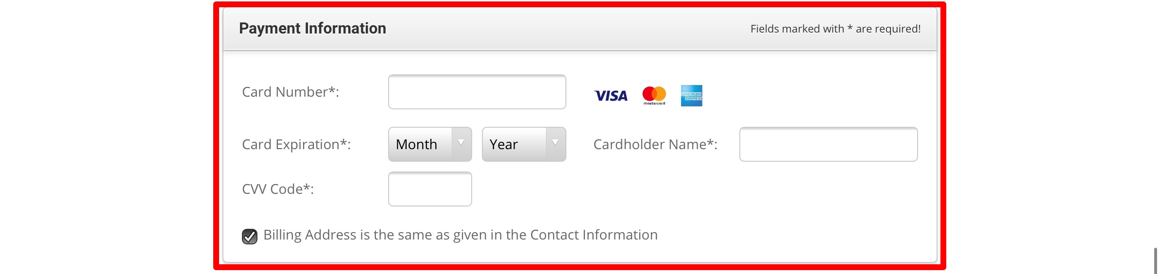 개인정보까지 입력하고 나면 결제 정보를 입력할 수 있습니다. 국제 결제가 되는 비자, 마스터, 아메리칸 익스프레스 카드로 결제를 할 수 있으며, 신용카드 정보를 입력해주시면 됩니다.