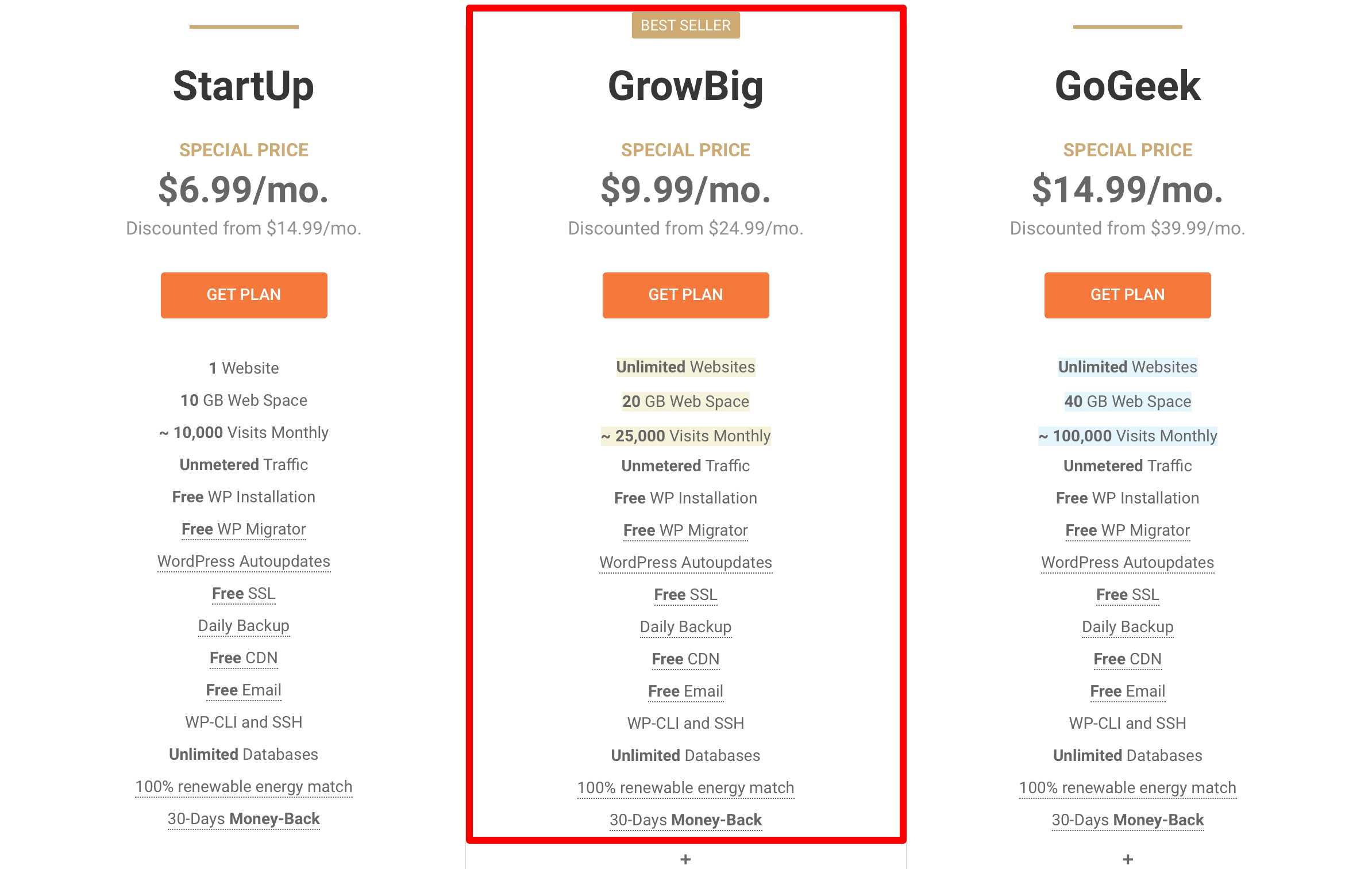 워드프레스 호스팅을 선택하고 들어가게 되면 위와 같이 3가지의 서비스를 볼 수 있습니다. StartUp, GrowBig, GoGeek인데 이 상품들은 호스팅 서비스의 저장공간이나, 월간 방문자 수에 대한 제한이 다르고, 추가로 웹사이트를 만들 수 있는 갯수도 제한이 있습니다. 첫번째 옵션인 StartUp을 제외하고는 다수의 웹사이트를 개설하는데 제한이 없습니다. 저는 가장 많이 사용하는 GrowBig을 선택했고, 가격은 월 9.99 달러입니다. (저렴한 가격은 아닙니다만, 여러가지 옵션들을 생각하면 타 호스팅보다 저렴하다고 볼 수 있습니다.)