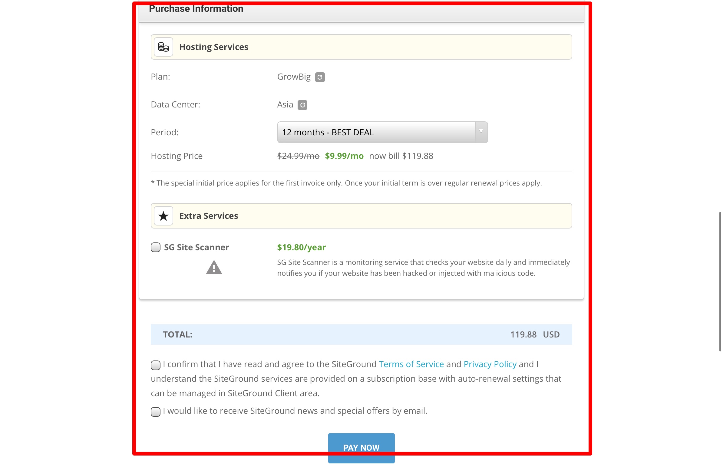이렇게 결제 정보까지 입력하고 나면 자신이 선택한 상품 정보를 확인할 수 있고, 기간은 얼마로 할지 정할 수 있는데 기간에 따라 할인율이 적용되기 때문에 본인의 의도와 목적에 맞게 선택하시면 되겠습니다. 저는 워드프레스가 처음이고 일단 애드센스 승인을 목표로 하기 때문에 12개월 기준으로 선택을 했습니다. 그러면 1년에 119.88달러 (한화로 약 15만원이 조금 안되는 돈이네요)를 결제하시게 됩니다. 아래 정책이나 유의사항을 읽어 보시고 Pay Now를 누르시면 결제가 완료 되고 사이트 그라운드 호스팅을 사용하실 수 있게 됩니다. 다음 포스팅에서는 사이트 그라운드에서 워드프레스를 설치하는 방법에 대해서 알아보겠습니다.