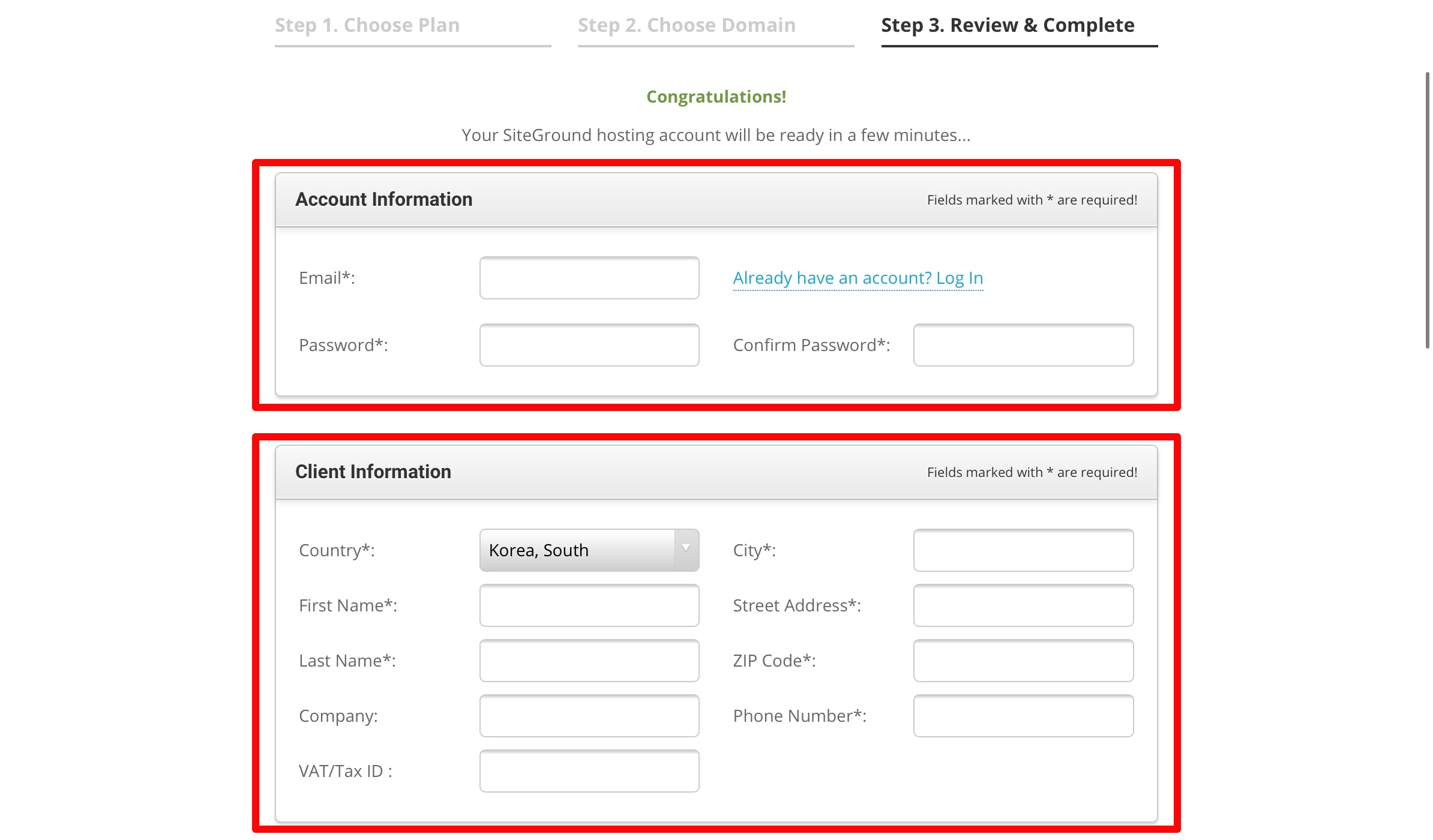 도메인을 입력하고 진행을 하면 사이트 그라운드 계정을 만들 수 있습니다. 이메일, 비밀번호를 입력하시고, 개인정보를 입력해주시면 됩니다. 주소와 이름, 그리고 우편번호까지 영어 기준으로 입력해주시면 됩니다.
