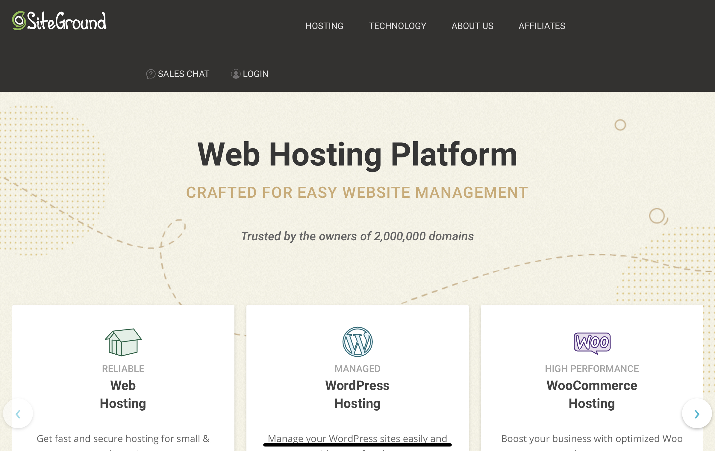 사이트 그라운드 홈페이지에 들어가면 위와 같은 화면을 보실 수 있습니다. 200만개의 도메인 사용자들이 신뢰하는 호스팅이라고 광고를 하고 있습니다. 사이트 그라운드에서는 웹 호스팅, 워드프레스 호스팅, 그리고 Woo 커머스 호스팅 서비스를 제공하고 있습니다. 다른 목적으로 호스팅을 하실 분들도 사이트 그라운드의 서비스를 이용하시면 좋을 것 같습니다.