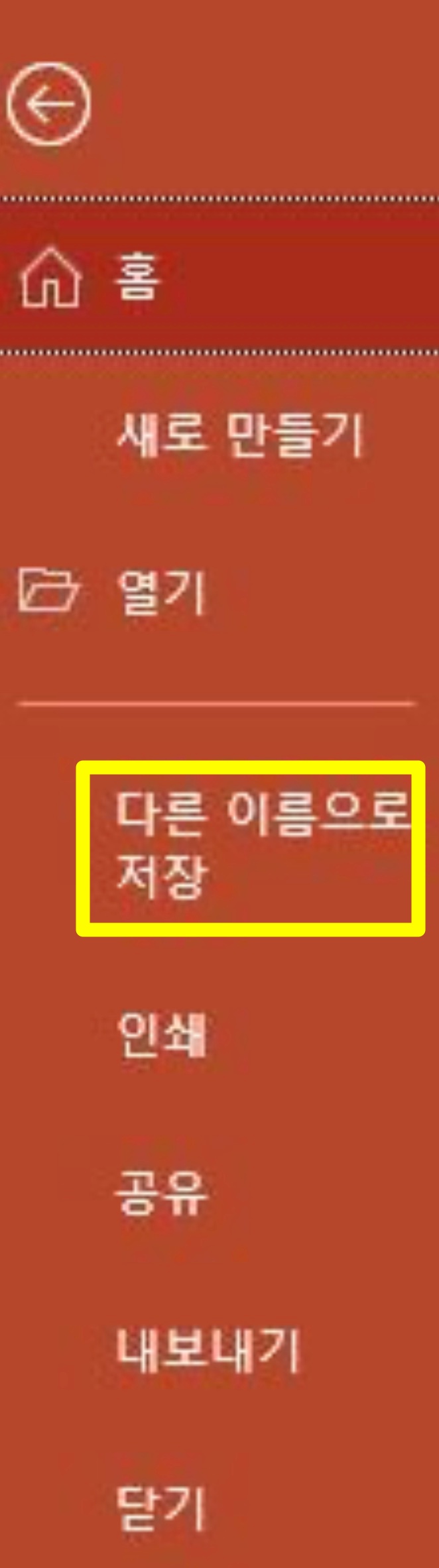 저는 마이크로소프트의 오피스 365라는 프로그램으로 PDF 파일로 변환하는 방법에 대해서 말씀드리겠습니다. 기타 하위 버전의 오피스의 경우에도 동일한 형태로 변환할 수 있으니, 참고하시기 바랍니다. PDF 변환을 위해서는 먼저 변환하고자 하는 문서를 열어줍니다. 저는 파워포인트를 예로 들어 설명하도록 하겠습니다. 파워포인트로 원하는 문서 작성 후 홈 메뉴에서 다르 이름으로 저장하기를 선택합니다.