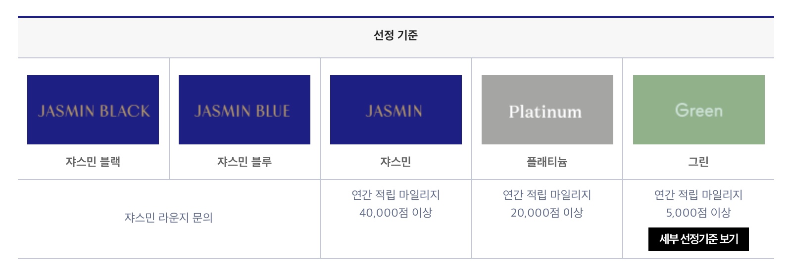 쟈스민 등급보다 상위 등급인 쟈스민 블루와 블랙에는 호텔과 스파 이용권, 식품관 상시 3% 할인(블랙) 등의 혜택이 추가 됩니다. 이 상위 등급은 선정 기준을 별도로 문의해야 하는 만큼 마일리지 뿐만 아니라 다양한 사항을 고려할 것으로 보입니다.