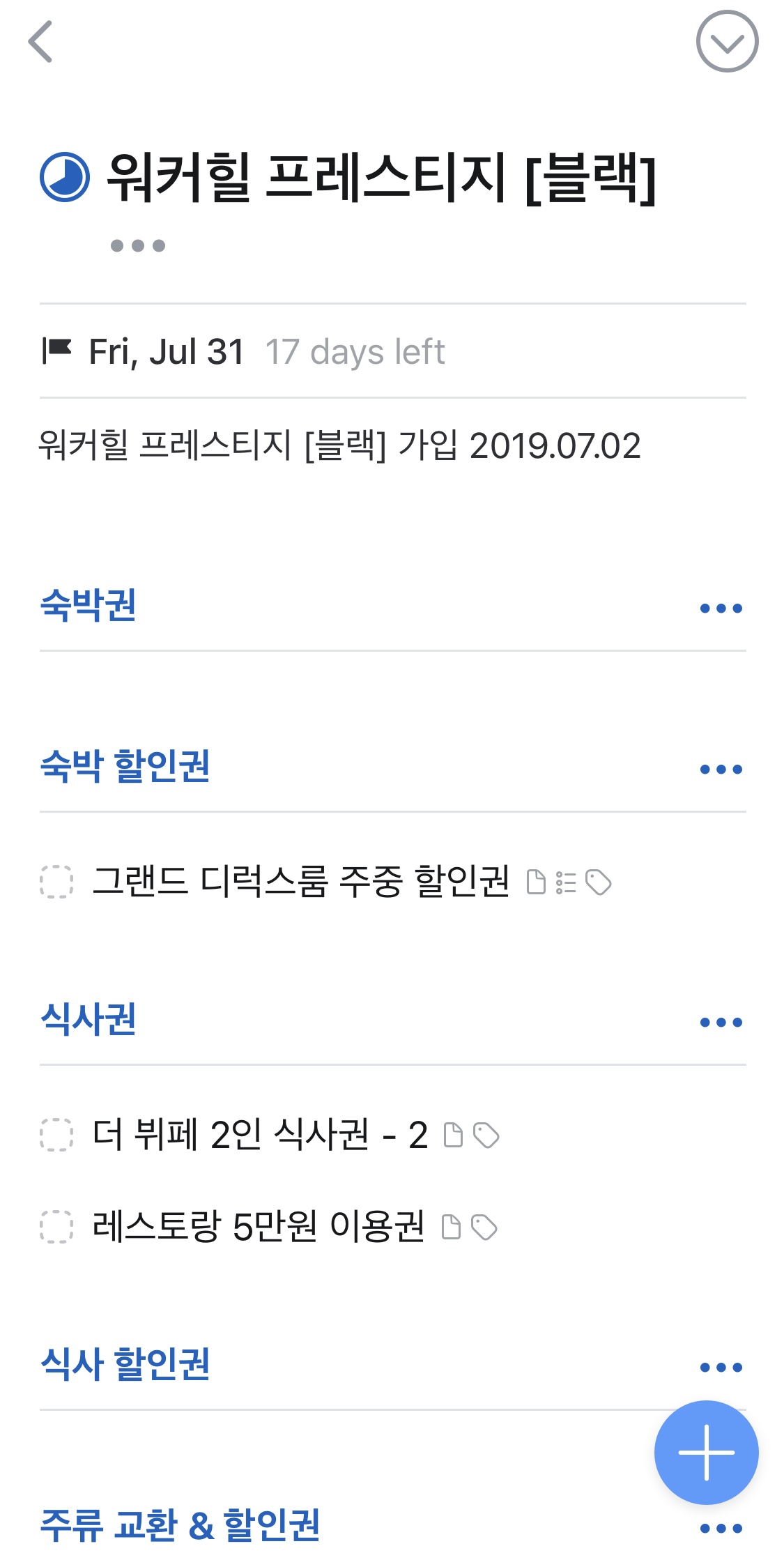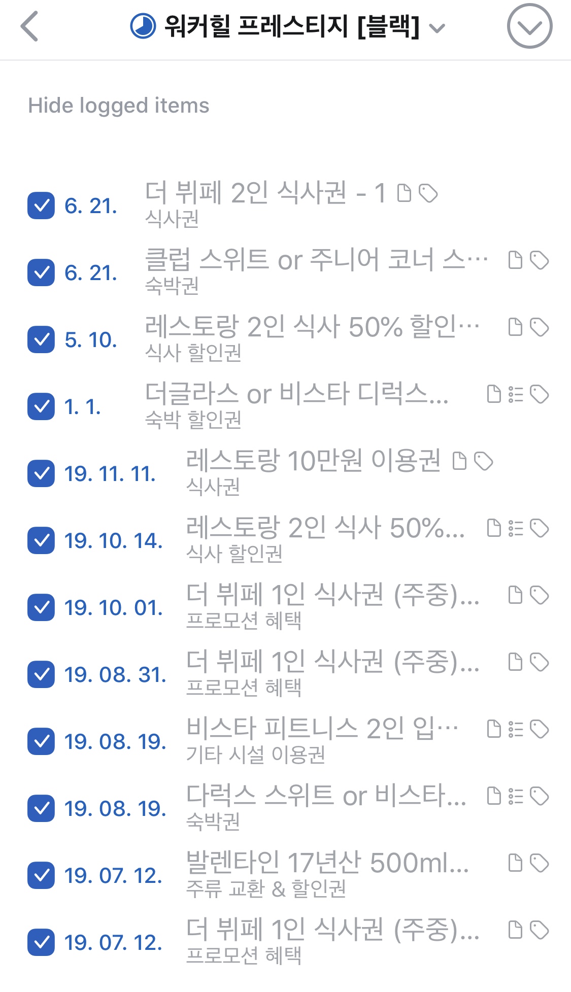 사실 이 부분은 저만의 사용 방법이긴 합니다만, 사용한 쿠폰과 사용하지 않은 쿠폰을 어떻게 관리할지 고민하다가 저는 아이폰 어플 중 Things3 이라는 어플로 관리를 하고 있습니다. 이 어플에 쿠폰 관련 내용을 체크 리스트로 만들어 놓고 사용할 때마다 체크를 하게 되면 사용한 쿠폰과 미사용 한 쿠폰을 한눈에 확인할 수 있어서 굉장히 편리하게 사용할 수 있습니다. 물론, 프레스티지 멤버십 라운지나, 카드 사용 후 영수증에 쿠폰 현황이 나오긴 합니다만, 저처럼 어플로 관리하실 분들은 참고하시고, 해당 어플에 대한 리뷰도 진행할 예정이니 많은 관심 부탁드립니다.