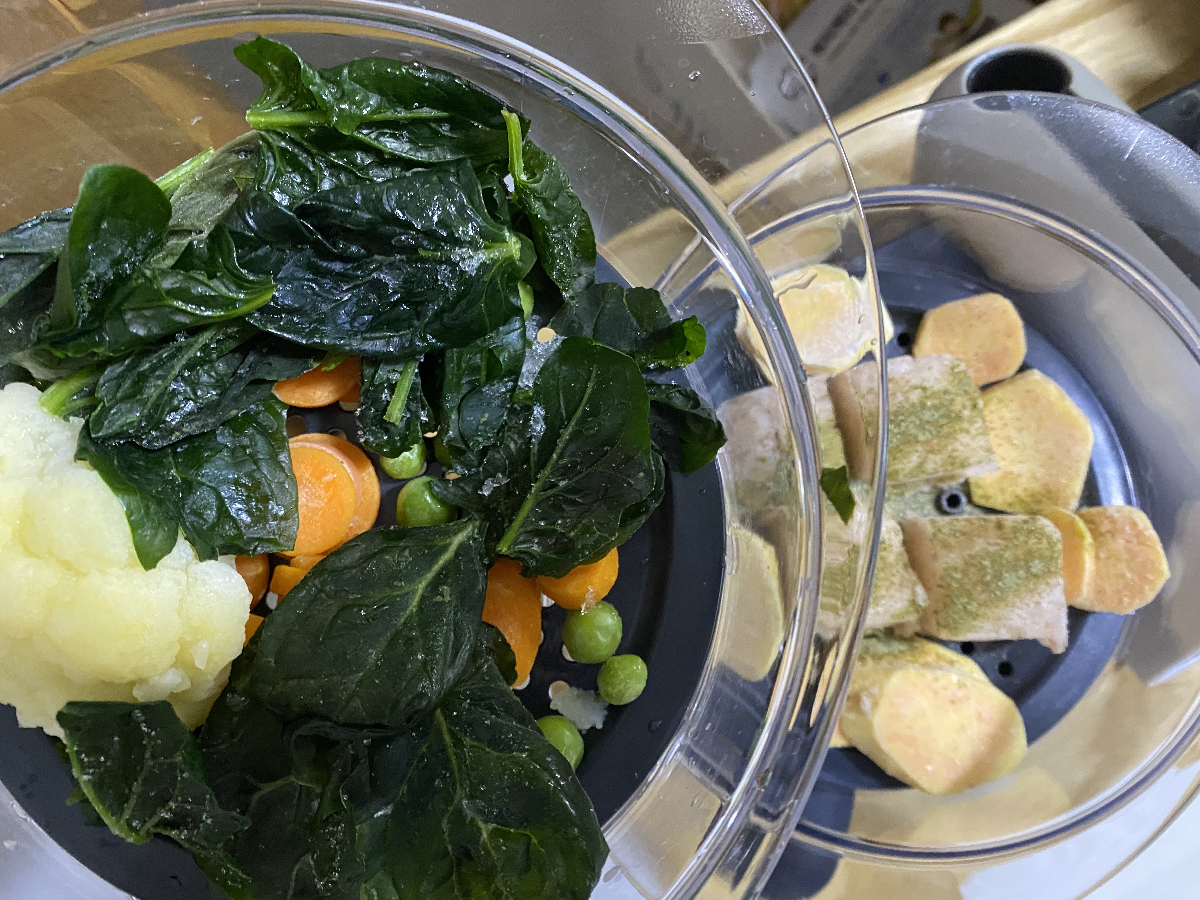 위 사진은 저희 와이프가 직접 딸 아이에게 만들어준 이유식 만드는 과정의 일부입니다. 보시면 3단으로 되어있는 찜기에 야채, 고기 등을 넣고 스팀으로 한번 쪄 주시면 아래에 육수 받이가 있어 채수부터 고기 육수까지 물 없이도 만들 수 있습니다. 여기에서의 팁은 야채를 가장 상단으로 하면 채수가 위에서부터 떨어지며 고기 육수가 더 맛있게 만들어진다는 것입니다. 이렇게 한번 스팀으로 찐 다음 바로 옆에 있는 믹서기에 밥과 재료들을 넣고 단계별로 갈아주면 초기 이유식부터 후기 이유식까지 모두 만들 수 있습니다. 이렇게 만들어진 이유식을 소분하여 냉동실에 얼려 두었다가 데워서 주면 바로 만든 이유식처럼 맛있는 이유식이 완성되고 저희 딸 같은 경우에는 너무나 잘 먹어줘서 많이 사용을 했었습니다. 또한 세척도 완전 분리가 되기 때문에 굉장히 위생적입니다. 믹서기의 모터 부분과 스팀이 나오는 부분을 제외하고는 완전 분리가 되며 각각 세척하여 사용할 수 있어 위생적이고 간편함 때문에 더 마음에 들었습니다.