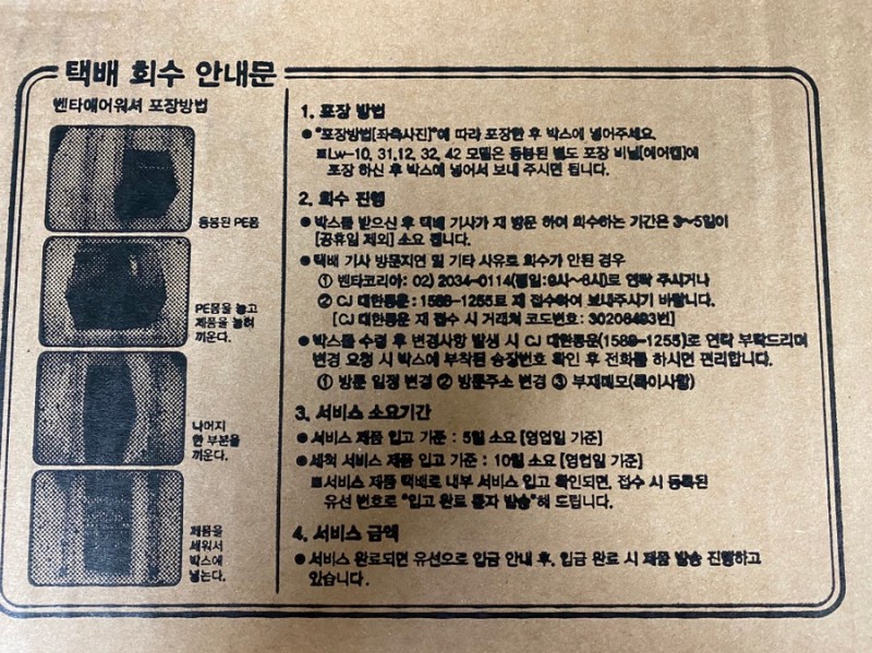 벤터 에어워셔를 포장하고 보내는 방법을 안내하고 있는데 간단하게 사용하던 제품을 잘 포장해서 반품의 형태로 신청 되어 있는 택배사에 다시 전달만 해주시면 됩니다.
