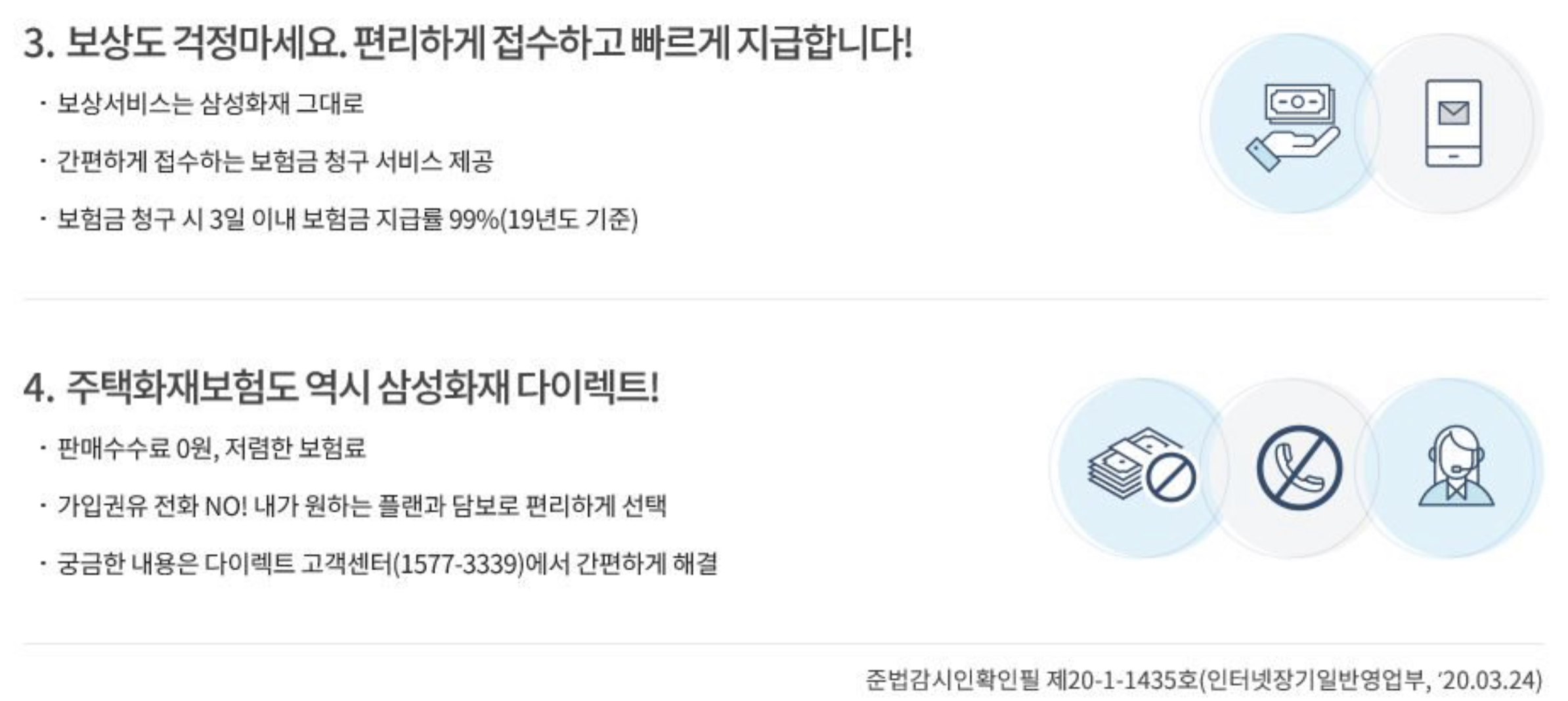사실 실손 의료보험 처럼 주택 화재 보험도 그 보장내역이 보험회마다 크게 다르지는 않습니다. 기본적으로 화재에 대한 주계약과 추가 도난이나 침수와 같은 추가 계약으로 나뉘는데 삼성화재의 주택화재 보험은 아래와 같은 장점이 있으니 보험 선택에 참고하시기 바랍니다.